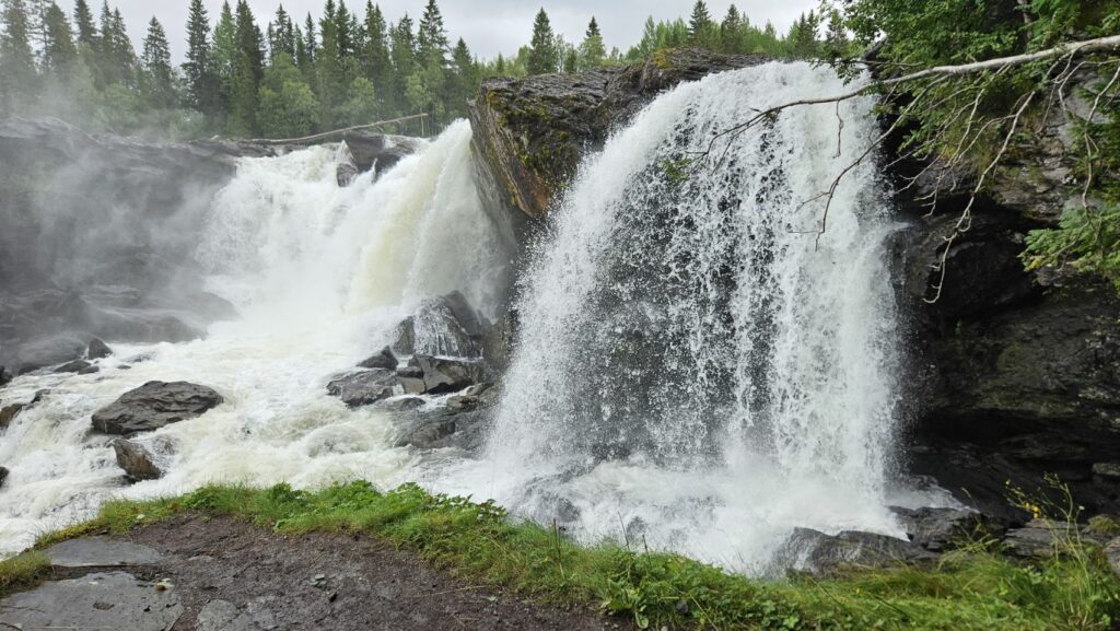 Nouvelle cascade sur notre route : Ristafallet. Située dans un cadre verdoyant et facilement accessible, elle est moins connue que