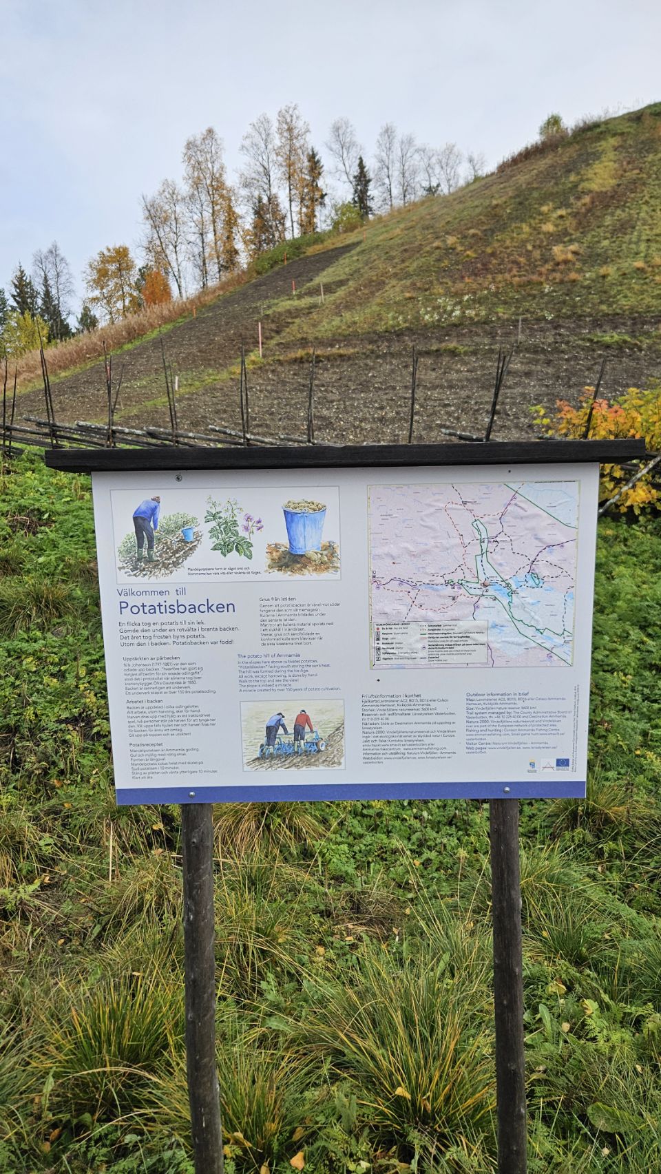 Quand le soleil fait enfin une apparition, on part explorer la célèbre Potatisbacken, la colline à pommes de terre. Cette colline en pente raide est un symbole d’Ammarnäs : depuis le XIXe siècle, les habitants y cultivent leurs pommes de terre, profitant du microclimat et du bon ensoleillement offerts par sa position plein sud. La montée se mérite, mais la vue au sommet est splendide : un panorama à 360° sur le village, la vallée et les montagnes environnantes.