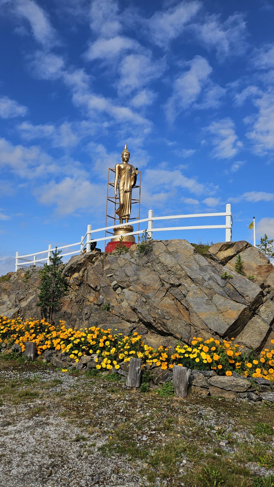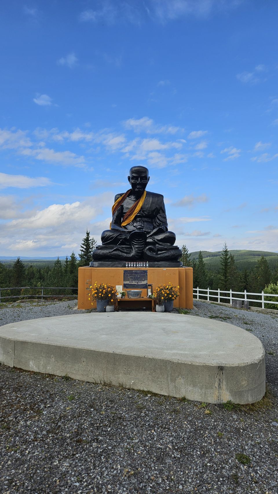 Sur la route, nous faisons une pause déjeuner insolite au Buddharama Temple de Fredrika. Niché au cœur des forêts du Västerbotten, ce temple bouddhiste est pour le moins surprenant dans le décor suédois. L’endroit a vu le jour grâce à une communauté thaïlandaise installée dans la région, et l’on y trouve désormais plusieurs bâtiments richement décorés, des statues de Bouddha, et même un grand projet de temple principal toujours en construction.