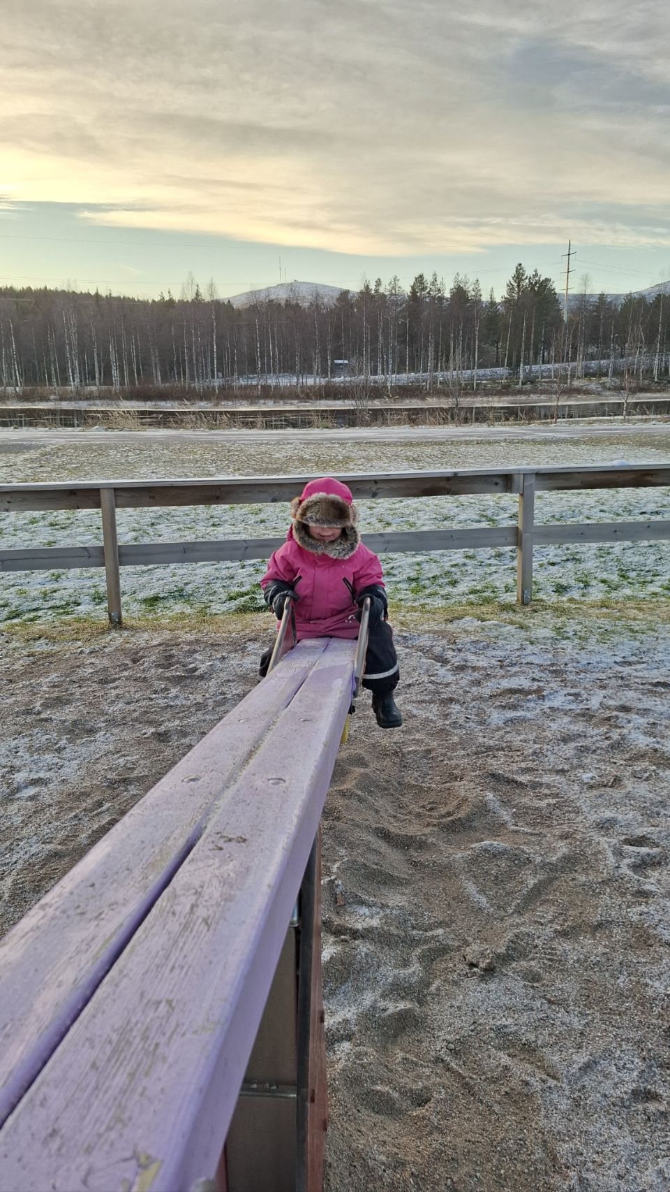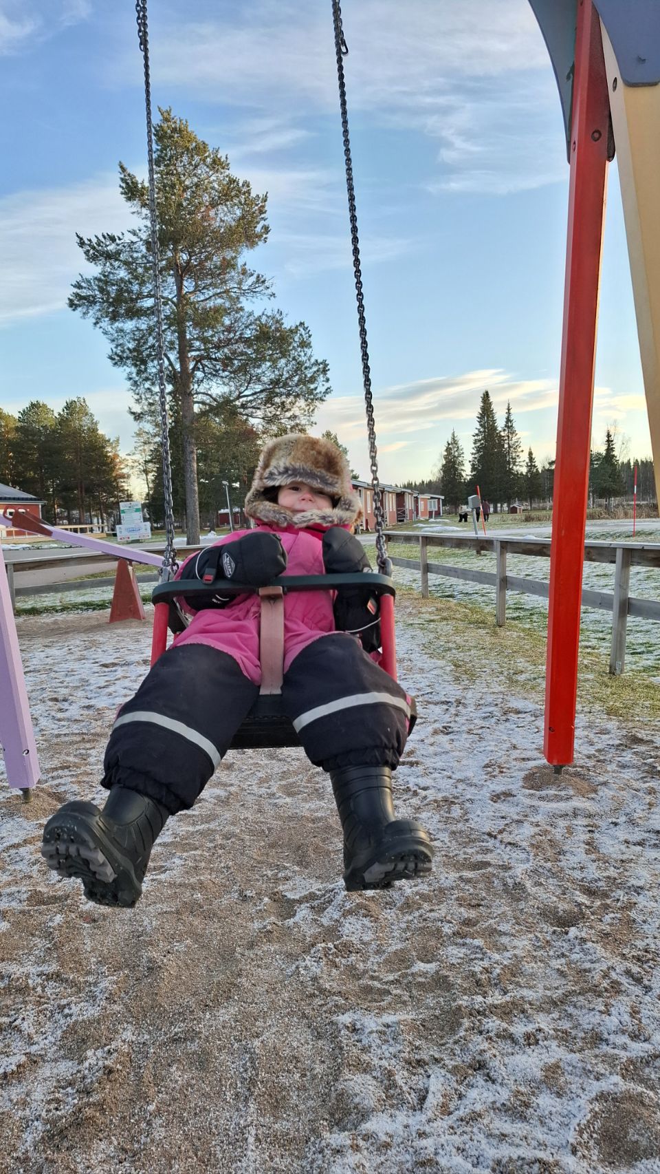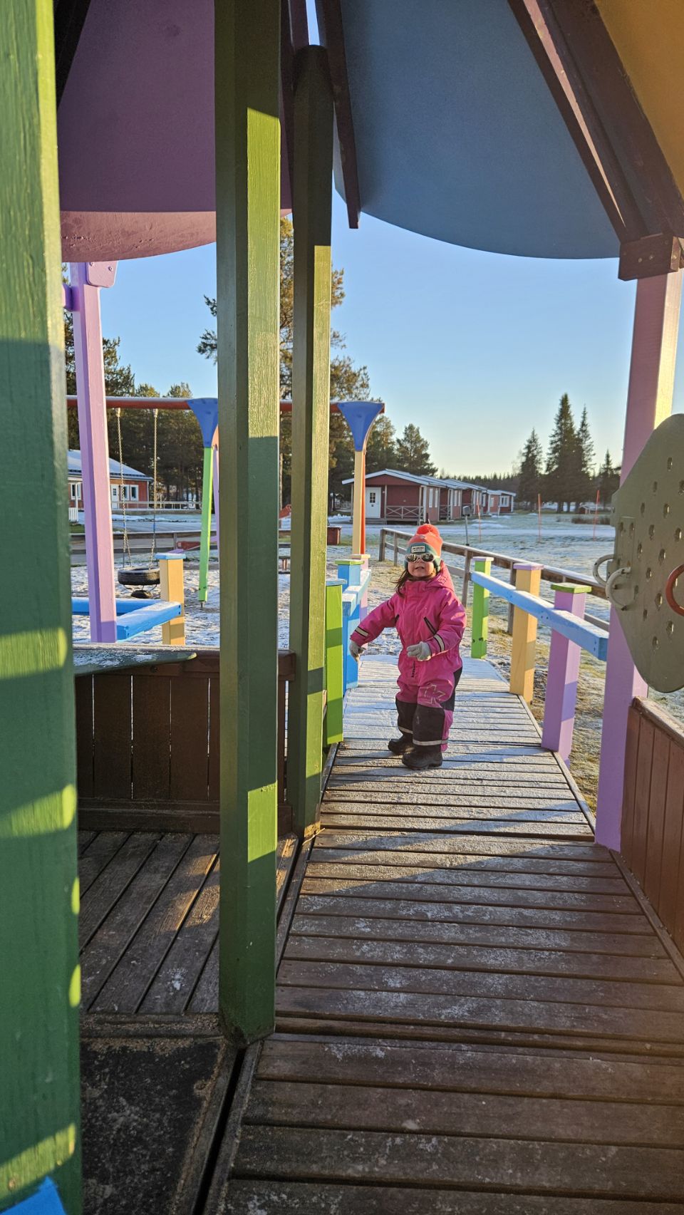 La neige est enfin annoncée pour les prochains jours, accompagnée des premiers vrais grands froids. On décide donc de se poser quelques jours au camping histoire d’aborder ça sereinement. À peine arrivés, Lou file découvrir l’aire de jeux : toboggan, balançoires, tunnel… Le froid ? Connaît pas !