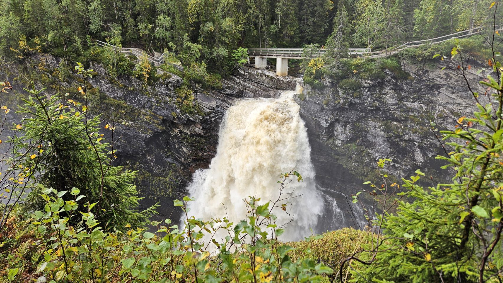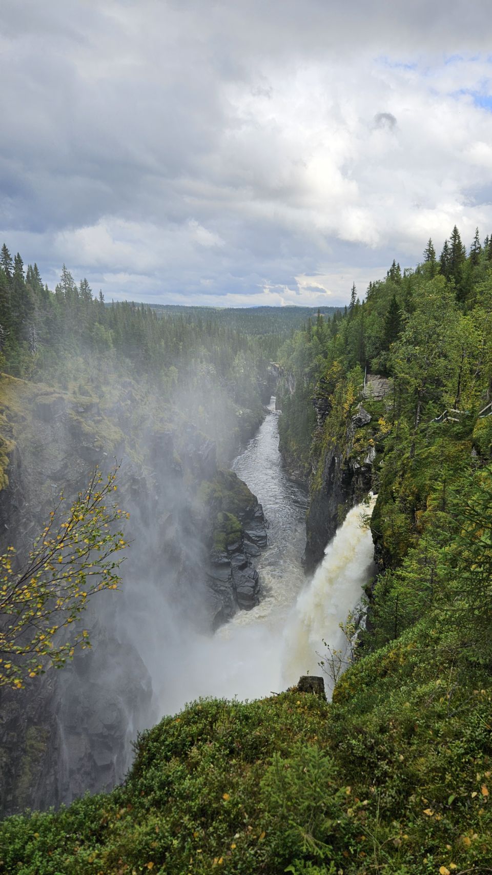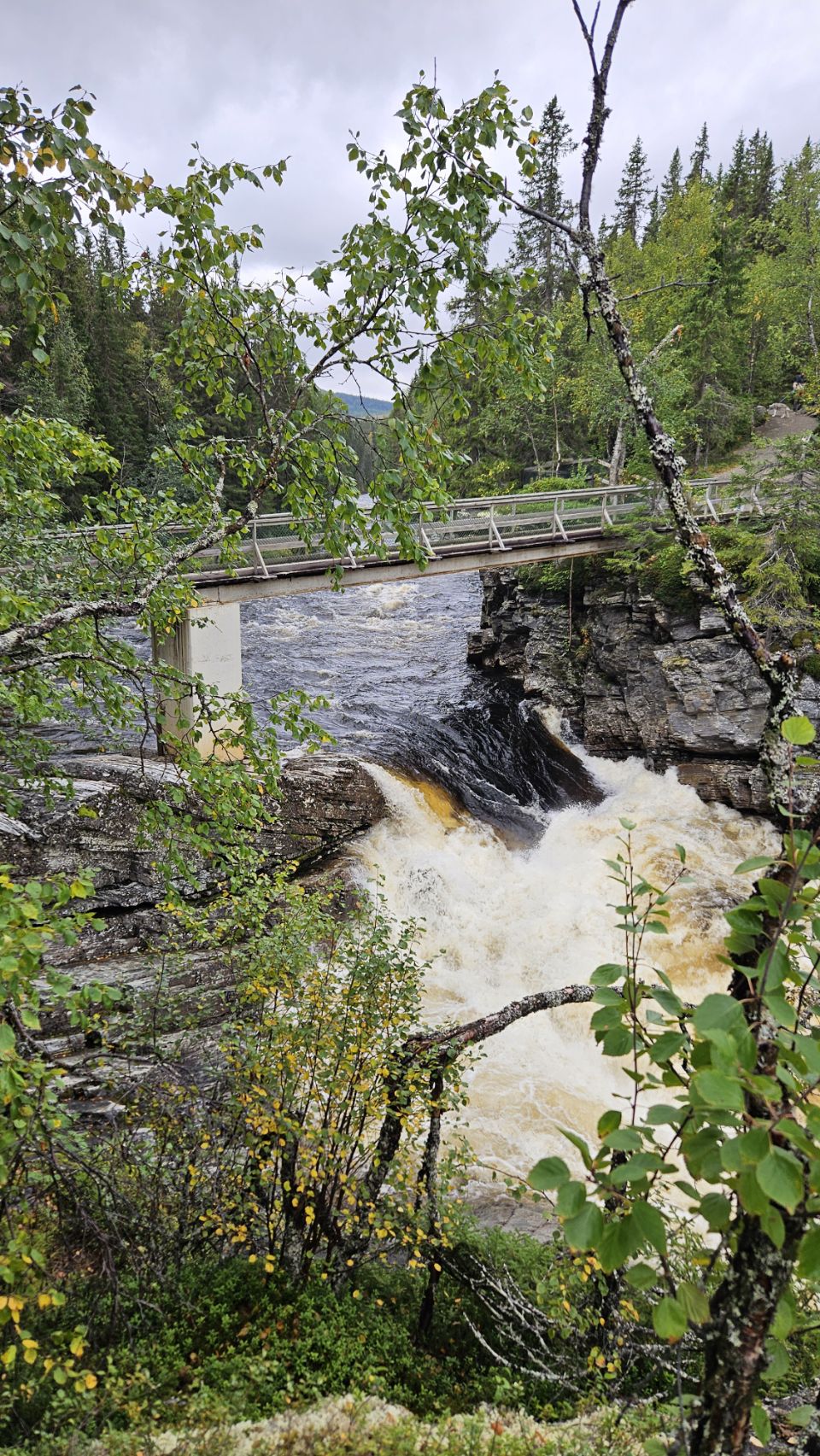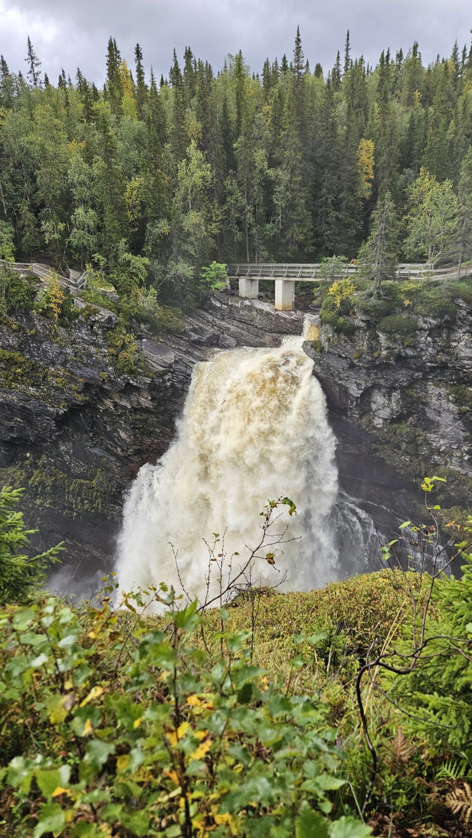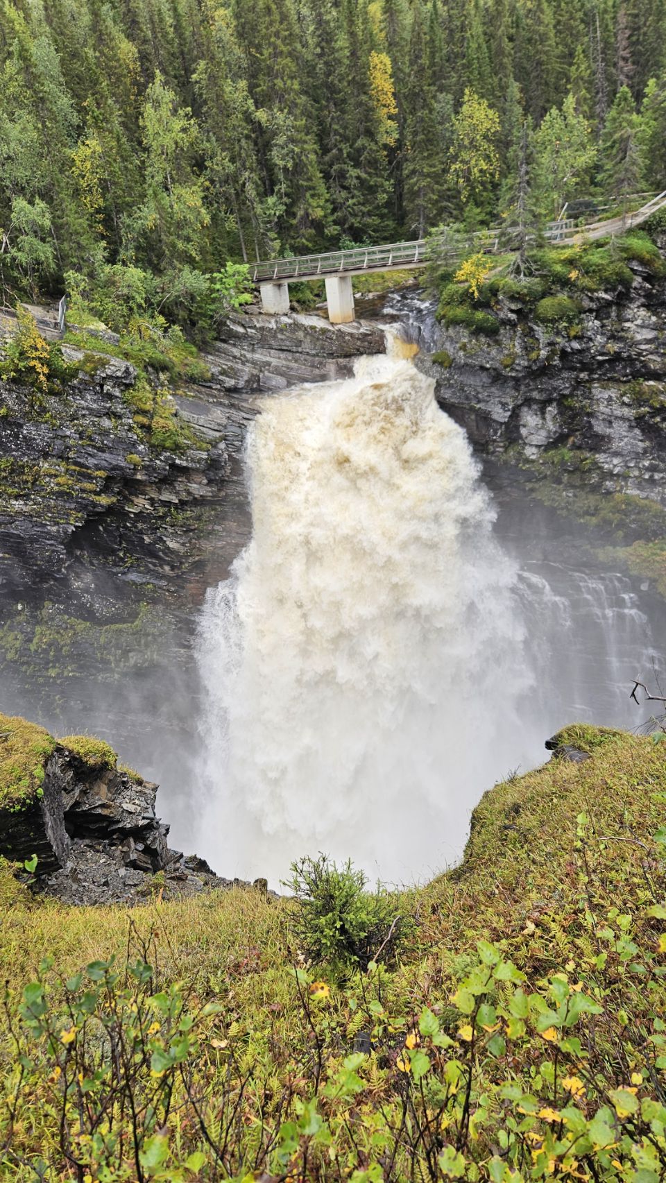 Nous voilà sur la fameuse Wilderness Road (Vildmarksvägen), une route mythique du nord de la Suède qui traverse forêts, montagnes et vastes étendues sauvages. Première halte : Hällingsåfallet, une spectaculaire cascade encaissée dans un canyon étroit. Avec ses 43 mètres de haut et près de 800 mètres de gorge creusée par l’eau, c’est l’une des plus impressionnantes de Suède.