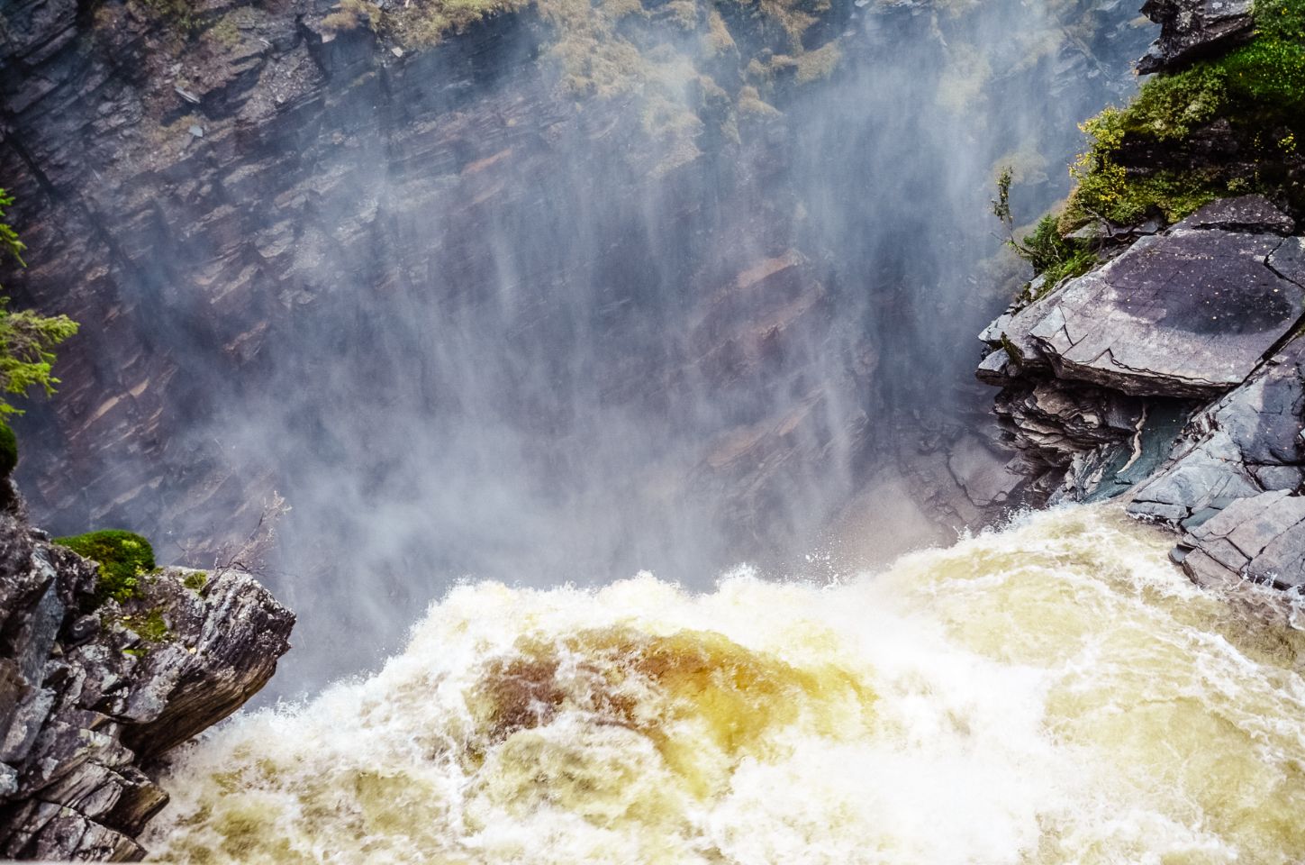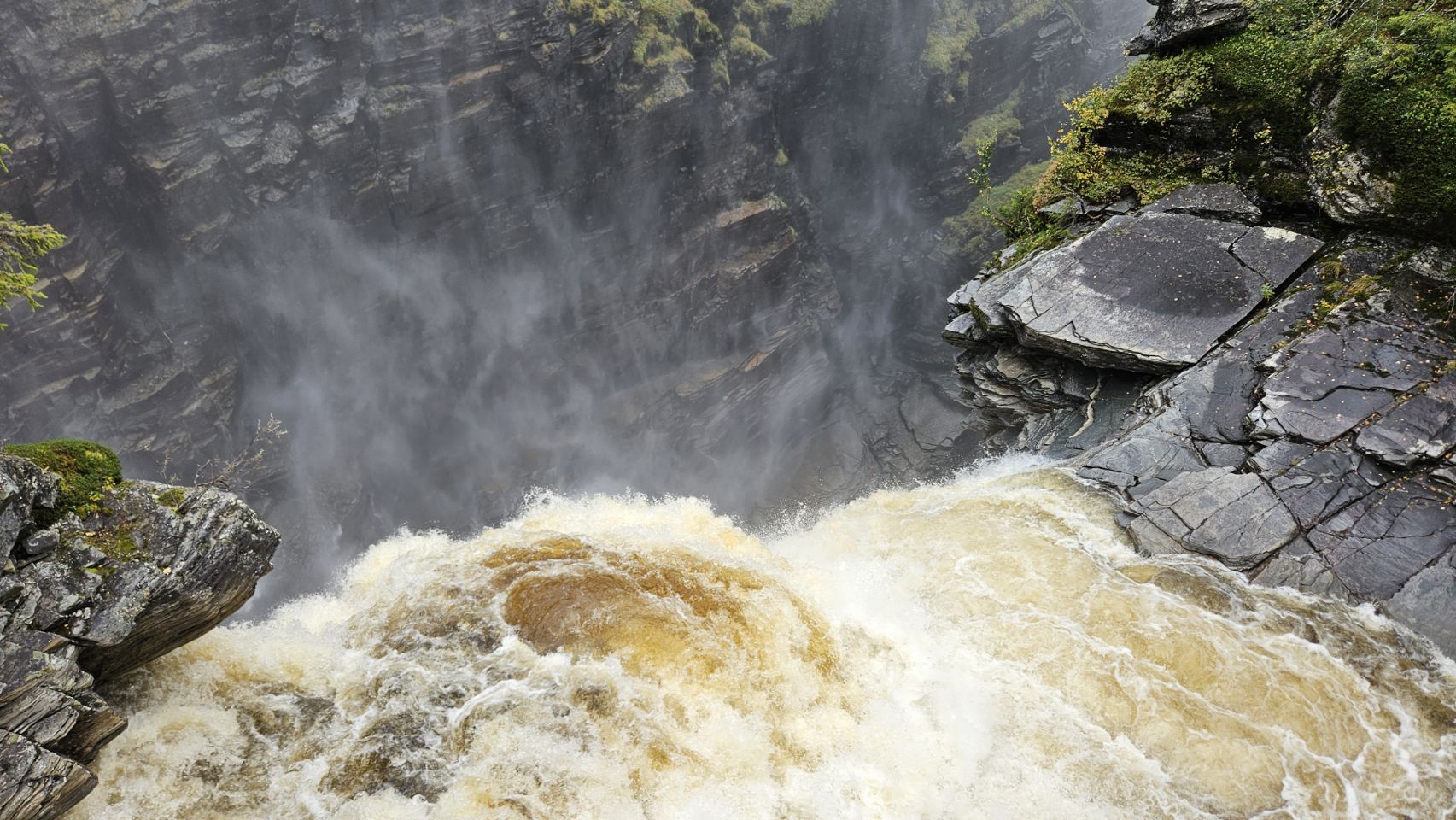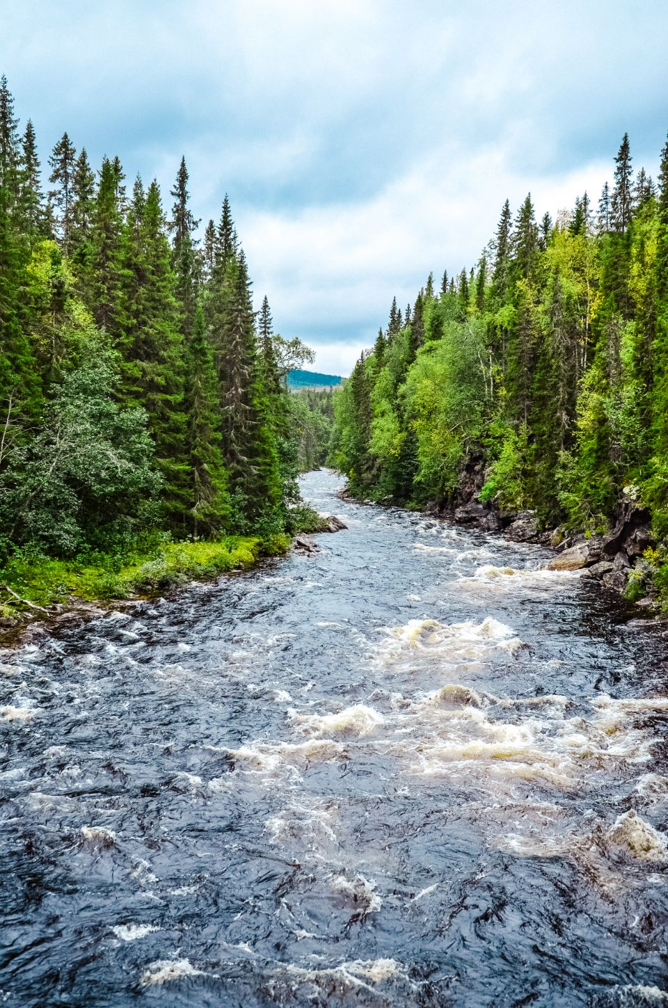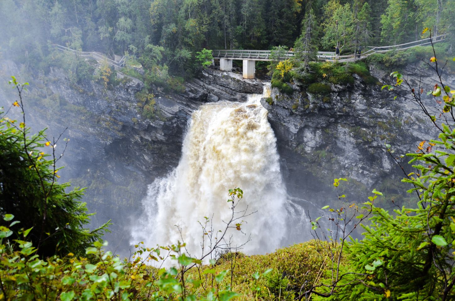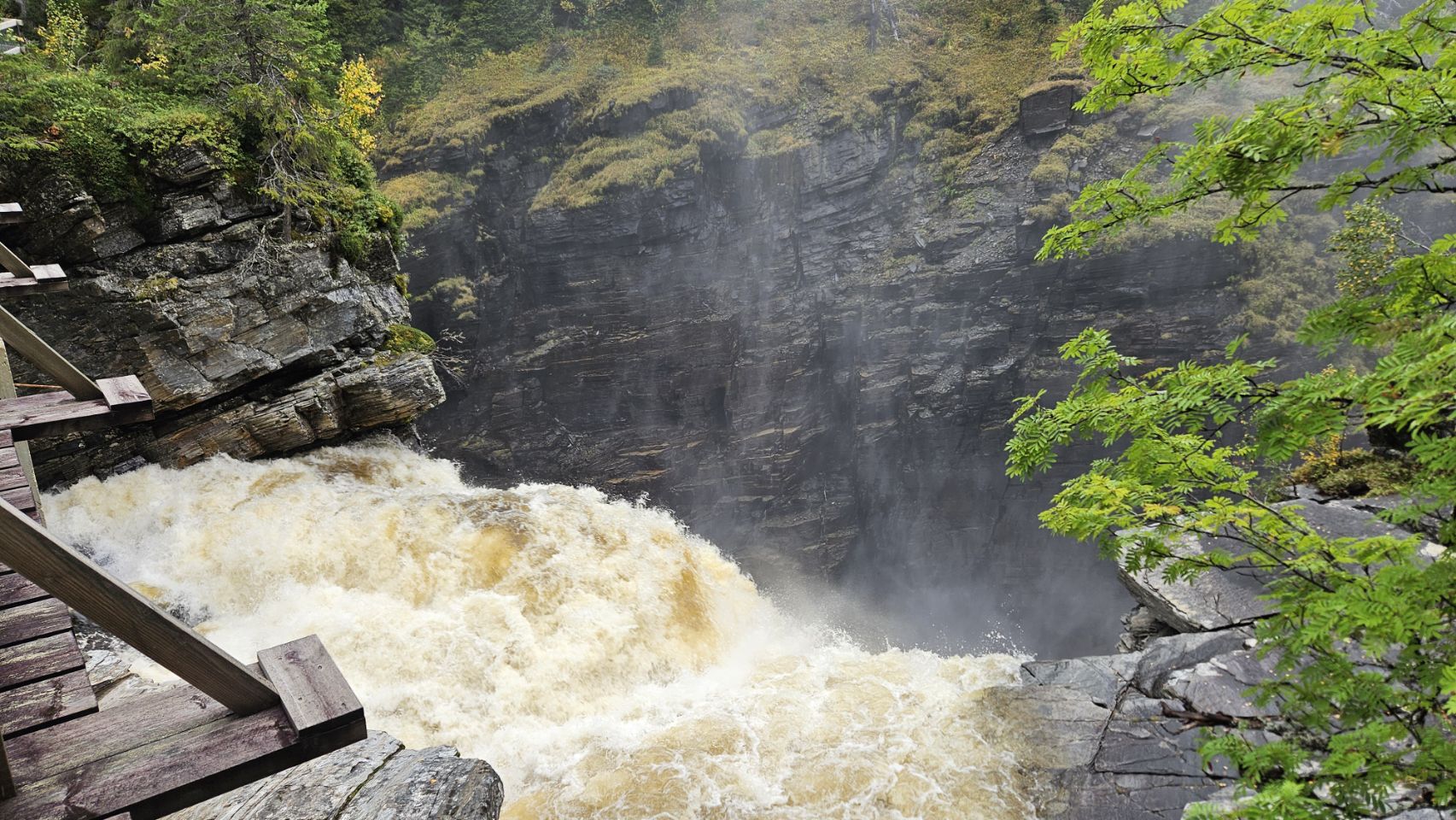 Nous voilà sur la fameuse Wilderness Road (Vildmarksvägen), une route mythique du nord de la Suède qui traverse forêts, montagnes et vastes étendues sauvages. Première halte : Hällingsåfallet, une spectaculaire cascade encaissée dans un canyon étroit. Avec ses 43 mètres de haut et près de 800 mètres de gorge creusée par l’eau, c’est l’une des plus impressionnantes de Suède.