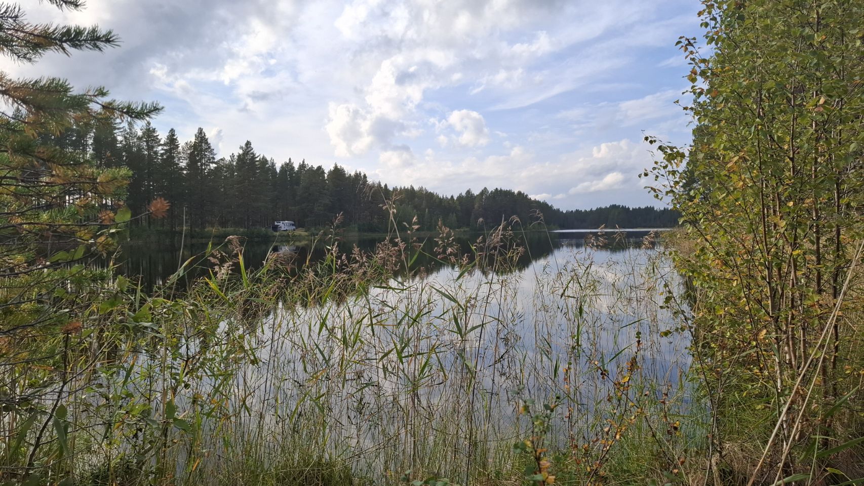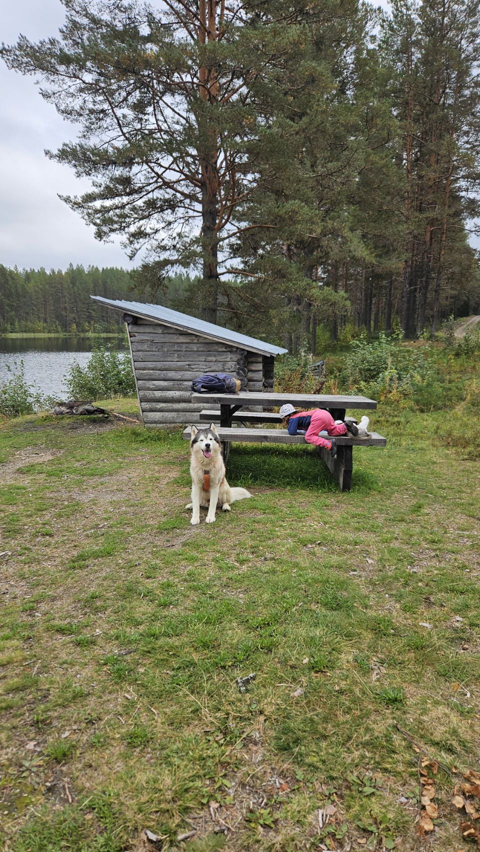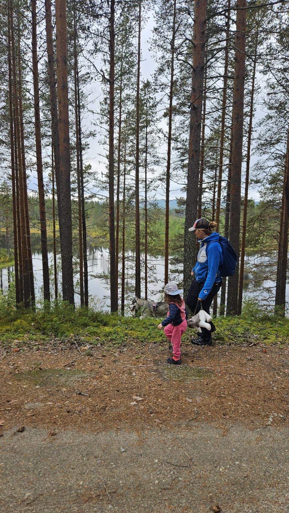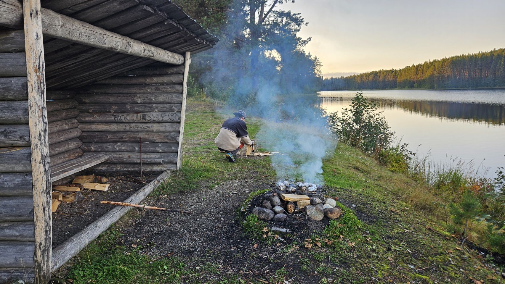 Nous arrivons en fin de journée à Långvattnet. Le spot est superbe : seuls au bord de l’eau, presque les pieds dans le lac. À peine installés, nous lançons le barbecue. Lou se régale à ramasser du bois pour le feu et nous aider, un vrai petit rituel qui rend le moment encore plus joyeux.