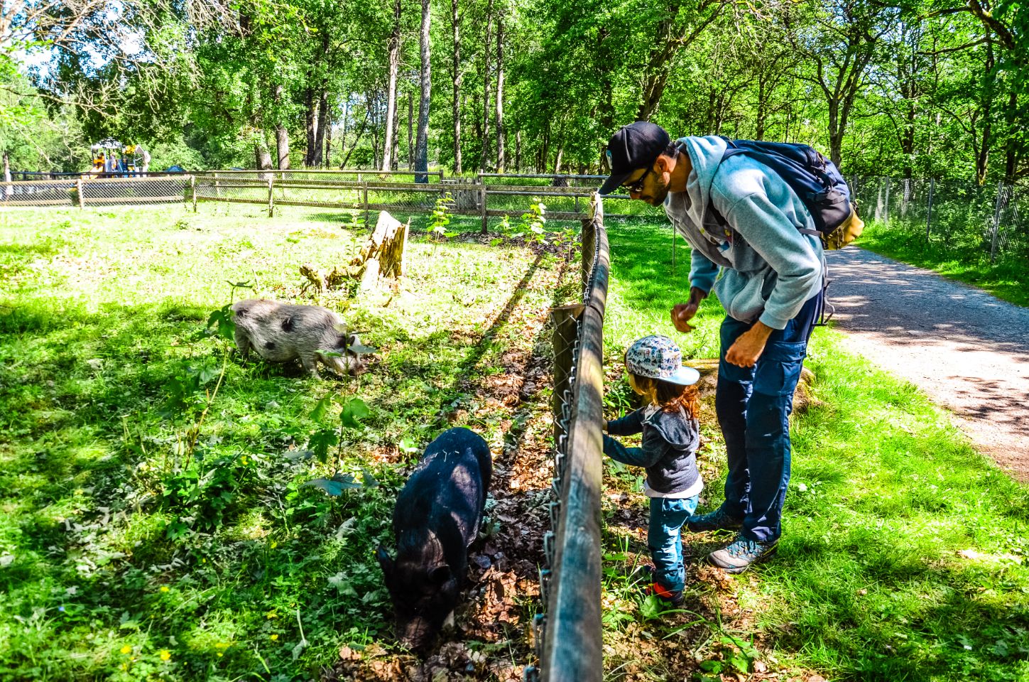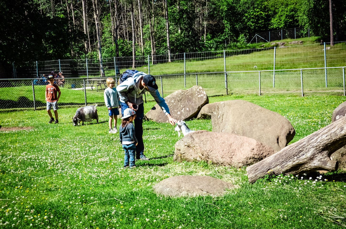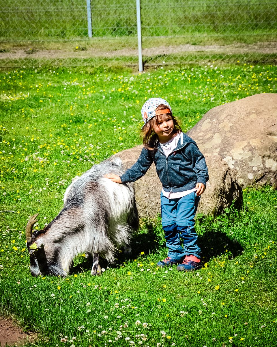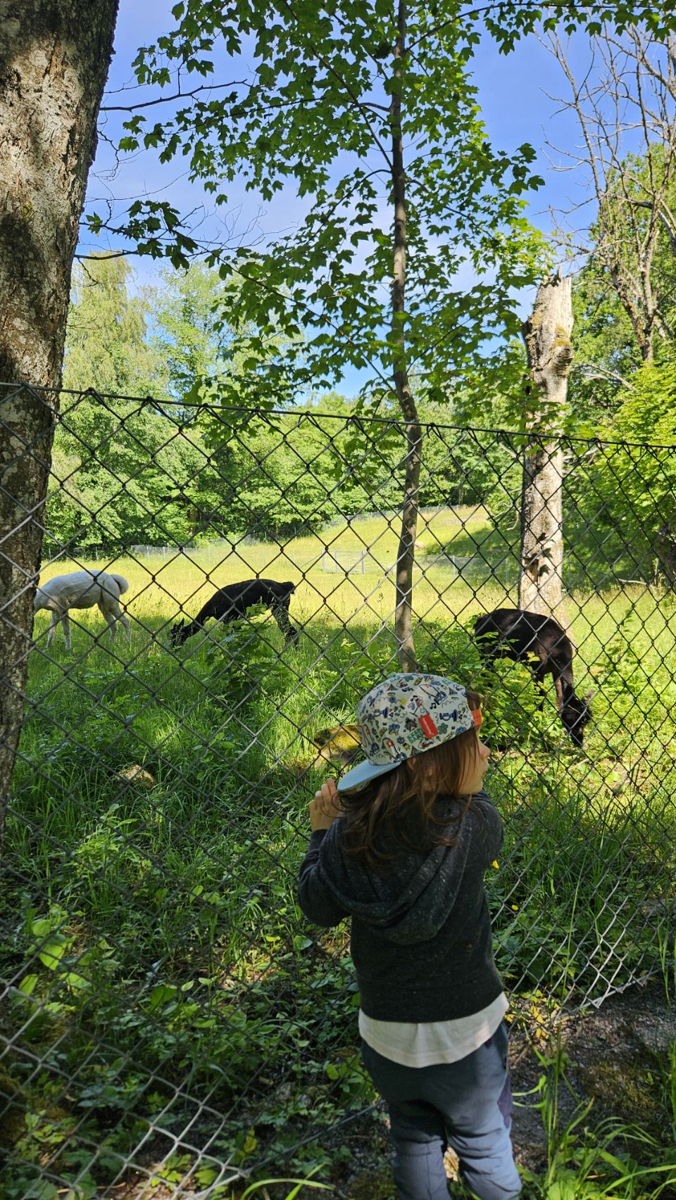 Le lendemain matin, on part à pied jusqu’au Djurspark, un petit zoo gratuit niché sur le plateau. C’est un vrai paradis pour les enfants : lamas, ânes, chèvres, moutons, biches, poules, lapins, cochons, mini poneys… Tout le monde est là !