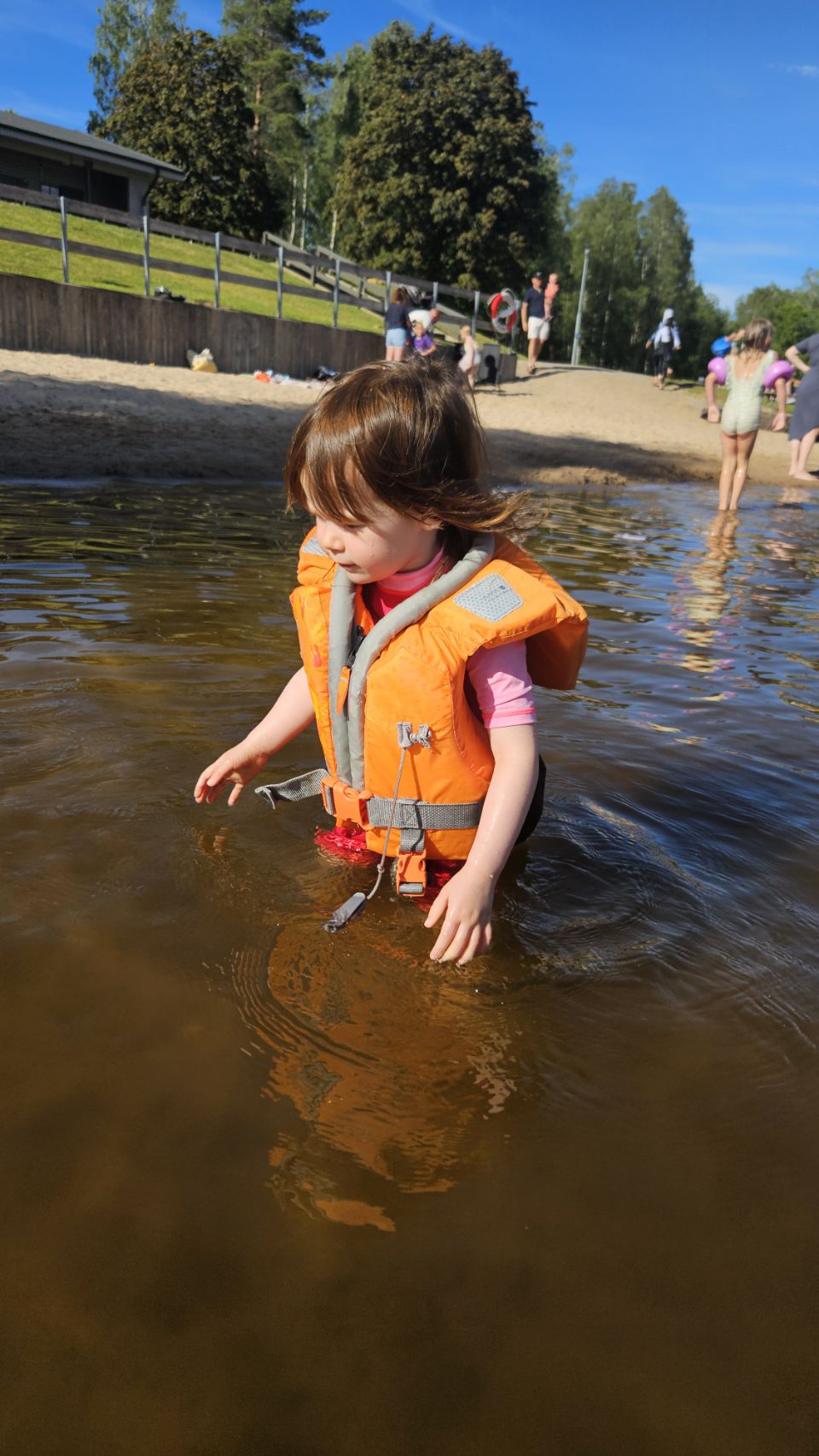 On part se balader autour de l’étang, où Lou observe avec de grands yeux les enfants qui se baignent dans ce qu’elle appelle “la piscine”. Ni une ni deux, Guillaume retourne au camping-car chercher son maillot de bain, et la voilà partie pour sa première vraie trempette !