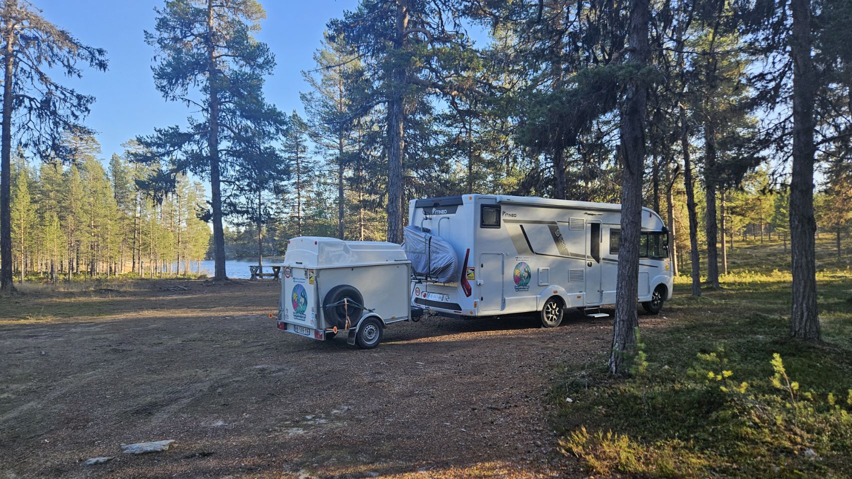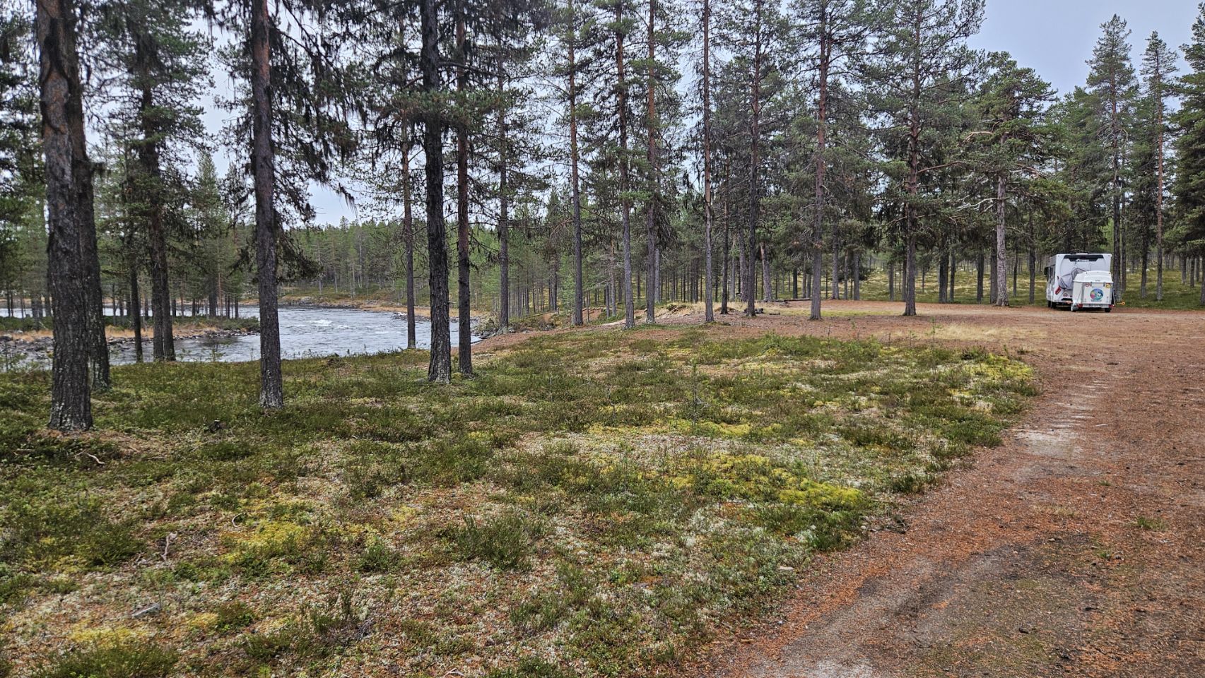 En route vers notre prochaine étape, on trouve un petit spot au bord de l’eau qui semble tellement paisible qu’on n’hésite pas longtemps avant d’y poser le camping-car. À peine arrivés, on est accueillis par quelques rennes curieux, le ton est donné. Ce qui devait être une simple halte pour la nuit se transformera finalement en trois jours de calme absolu, tellement on s’y sent bien.