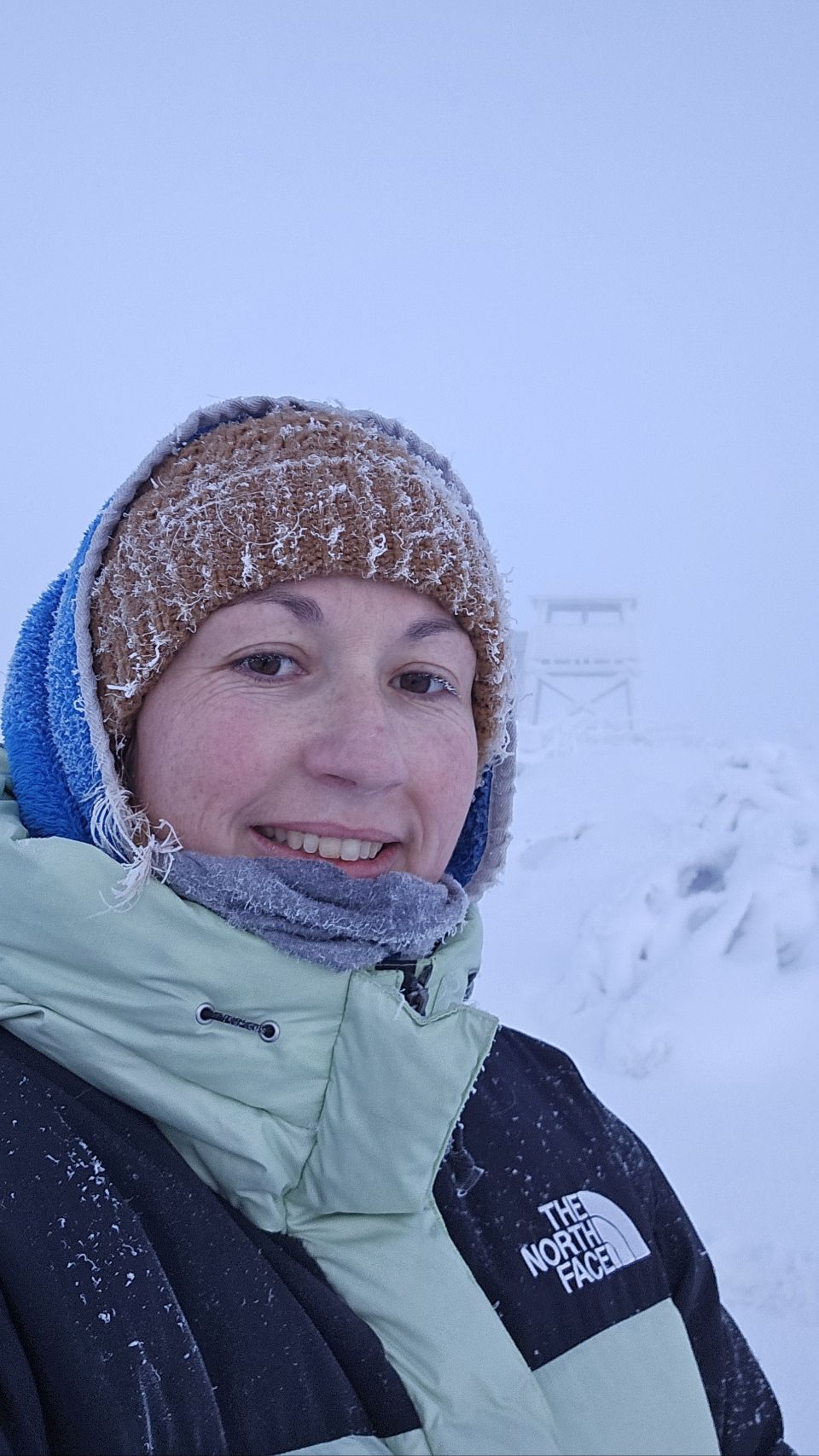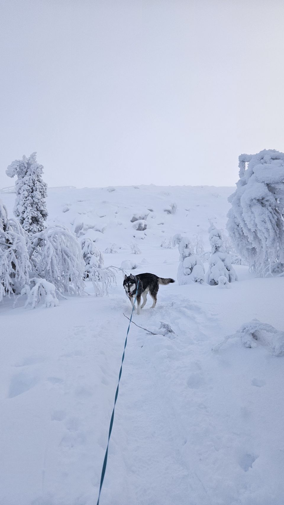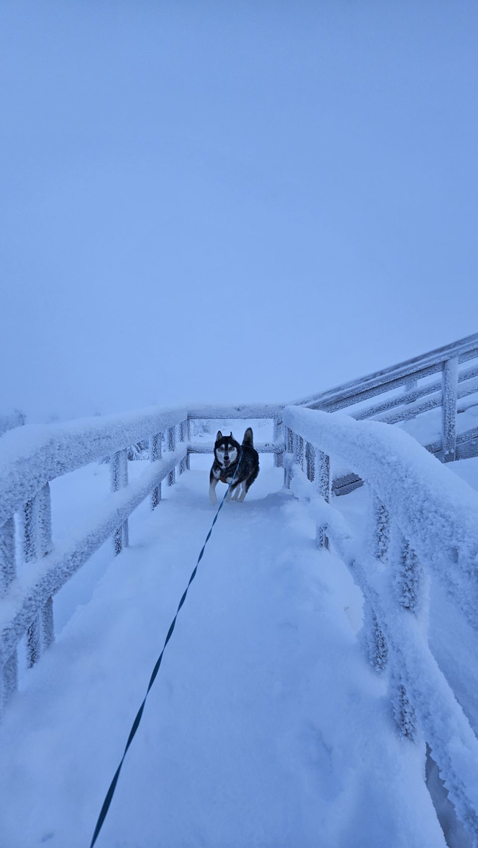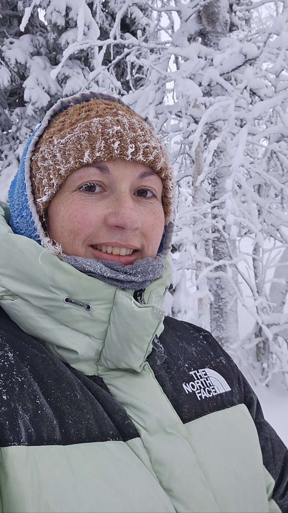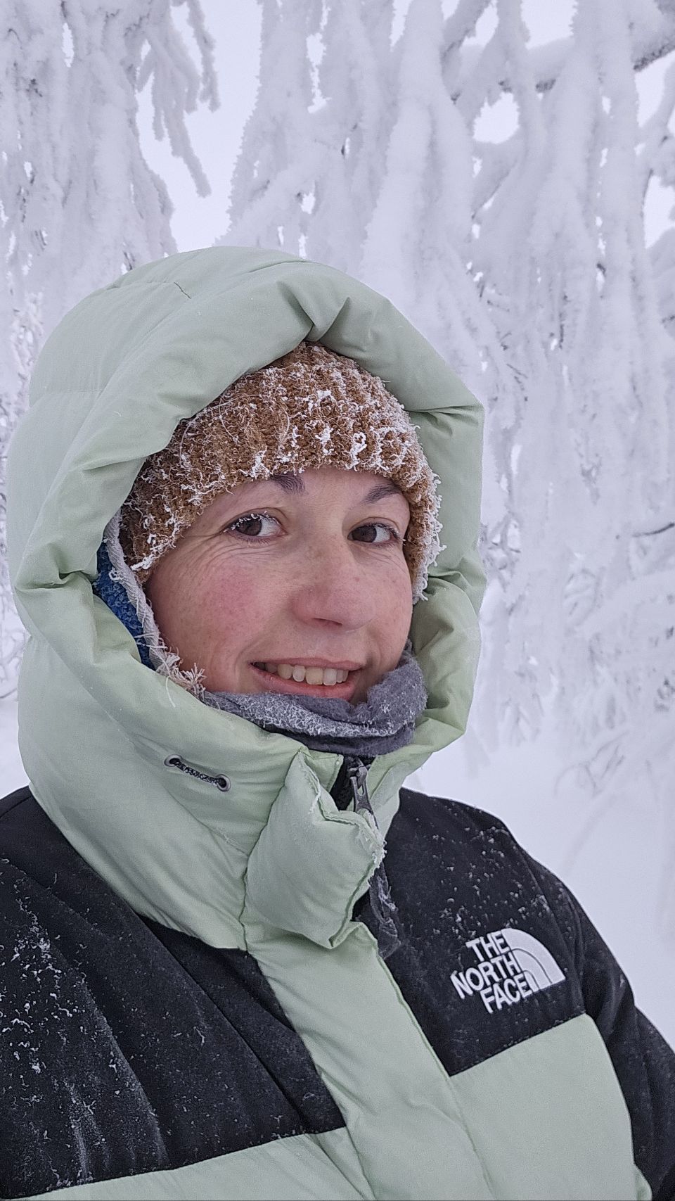 En arrivant près du sommet, la forêt s’ouvre légèrement. Le brouillard est bien présent, ce qui nous prive de la vue panoramique, mais l’ambiance est saisissante. Le vent est glacial, mordant. En quelques minutes à peine, Phao devient tout blanc, couvert de givre, et moi aussi. Mes cheveux sont figés par le froid, mes cils blanchissent… un mascara 100 % naturel version Laponie.