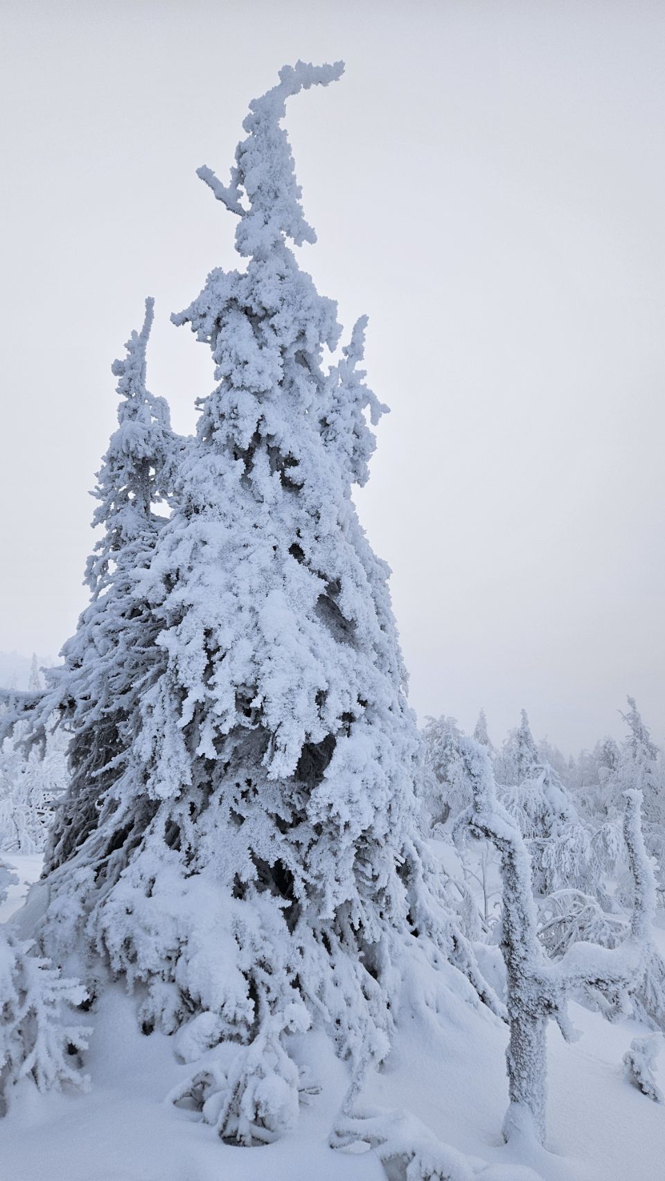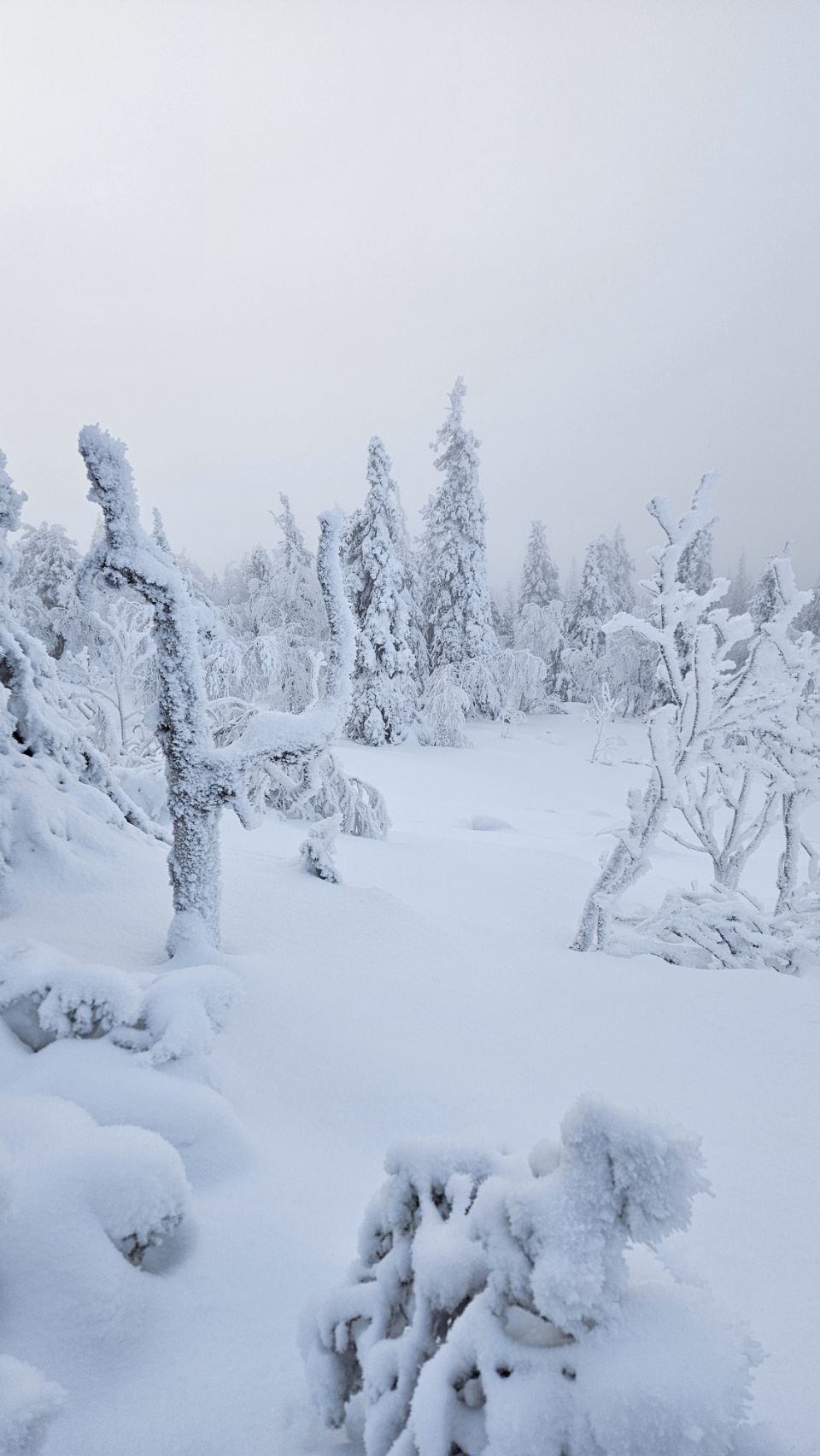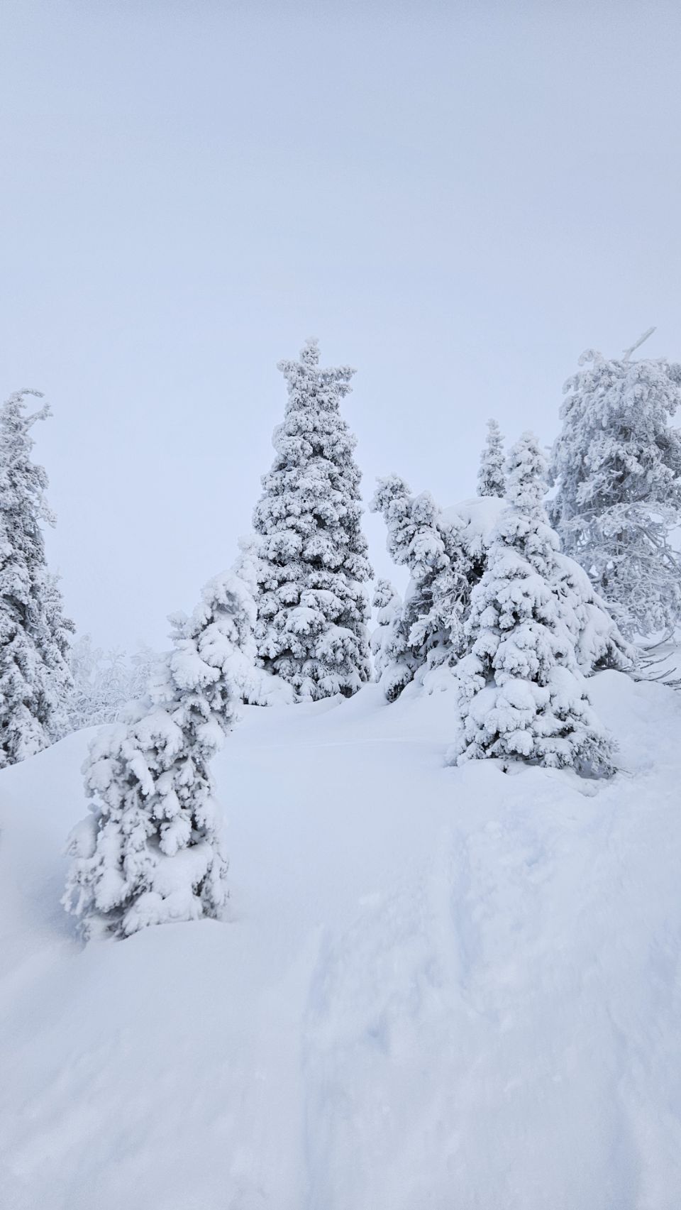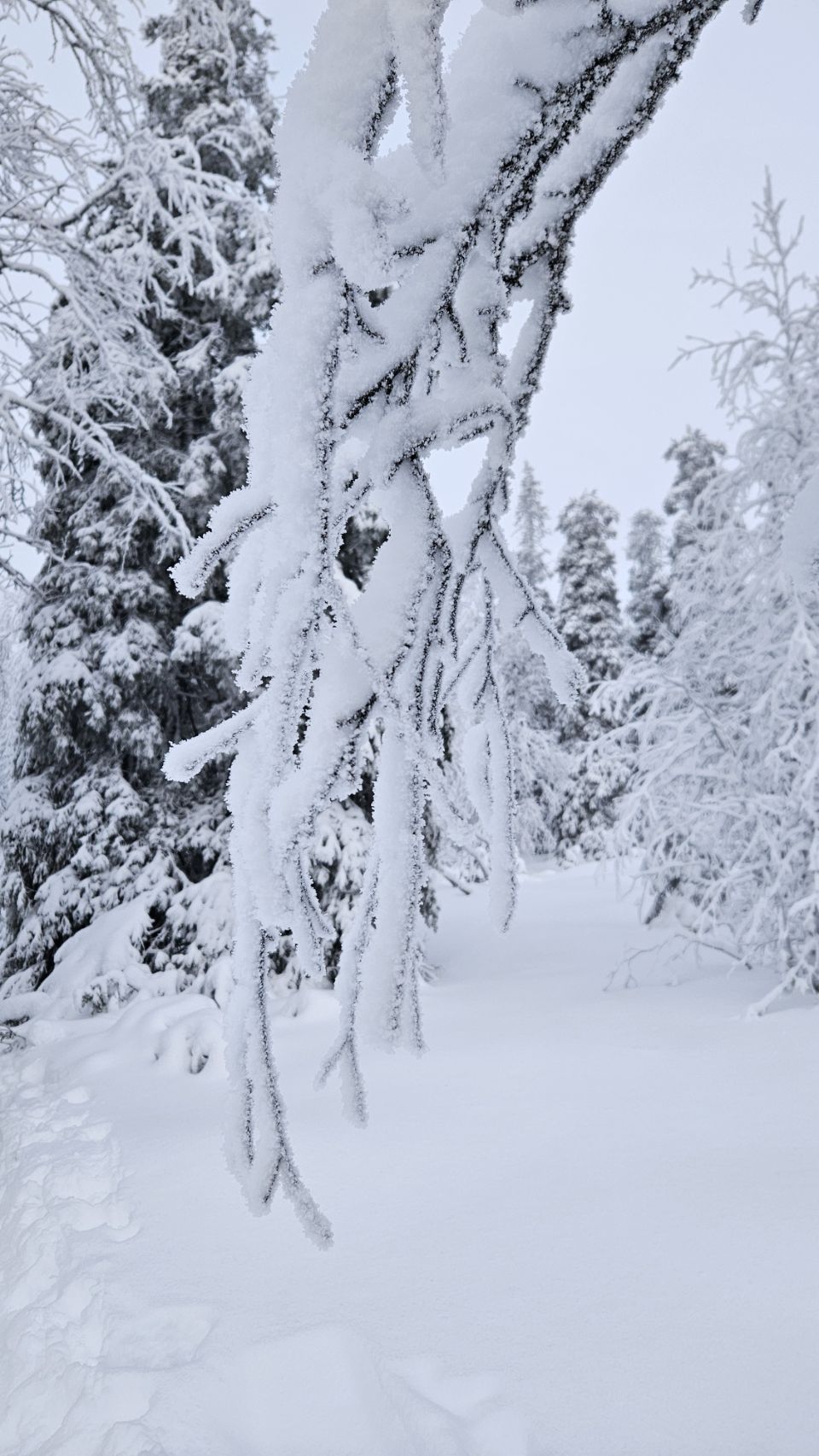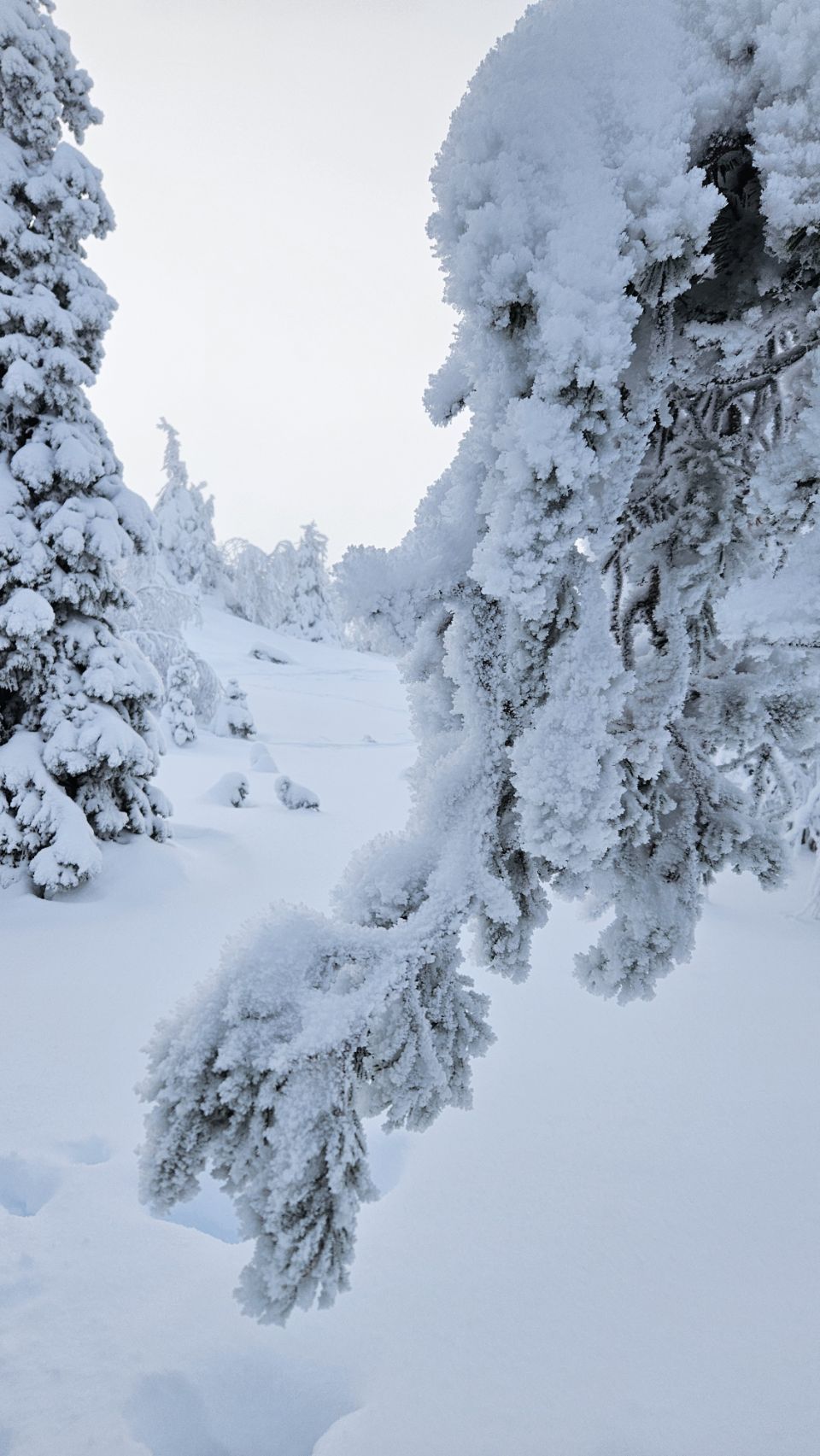 Chaque pas nous plonge un peu plus dans cette atmosphère irréelle. Tout est blanc. Le sol, les arbres, l’air semble presque immobile. C’est une sensation difficile à décrire, mais profondément marquante : un mélange de plénitude, de calme absolu, et de respect face à une nature aussi dure que magnifique.