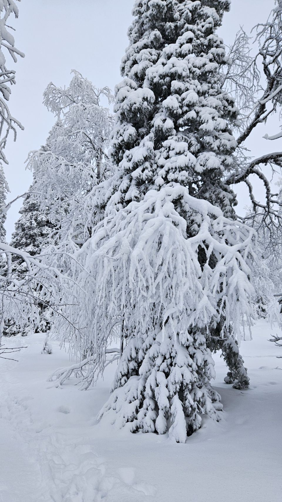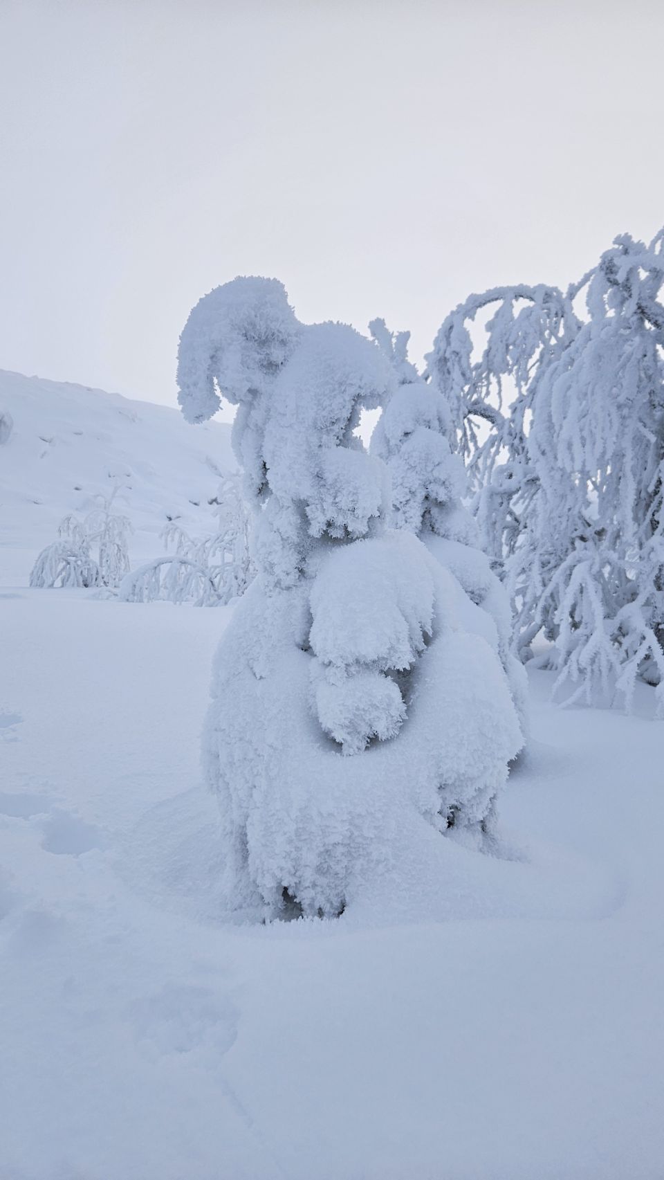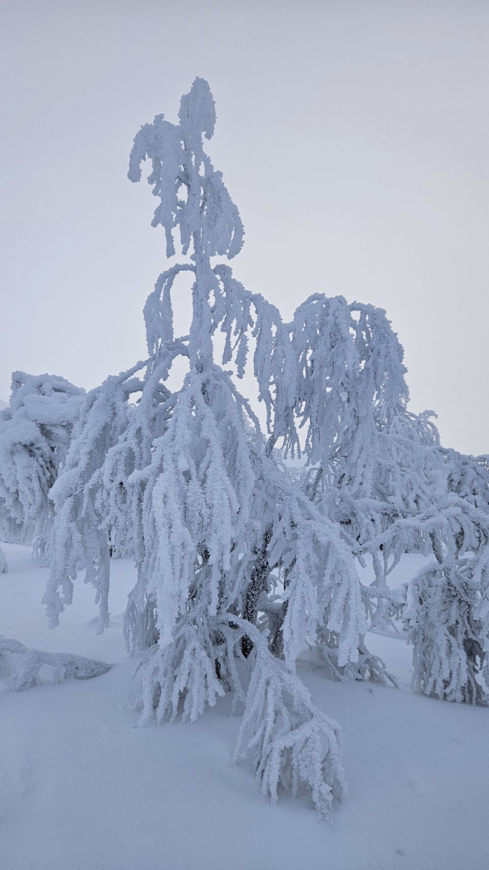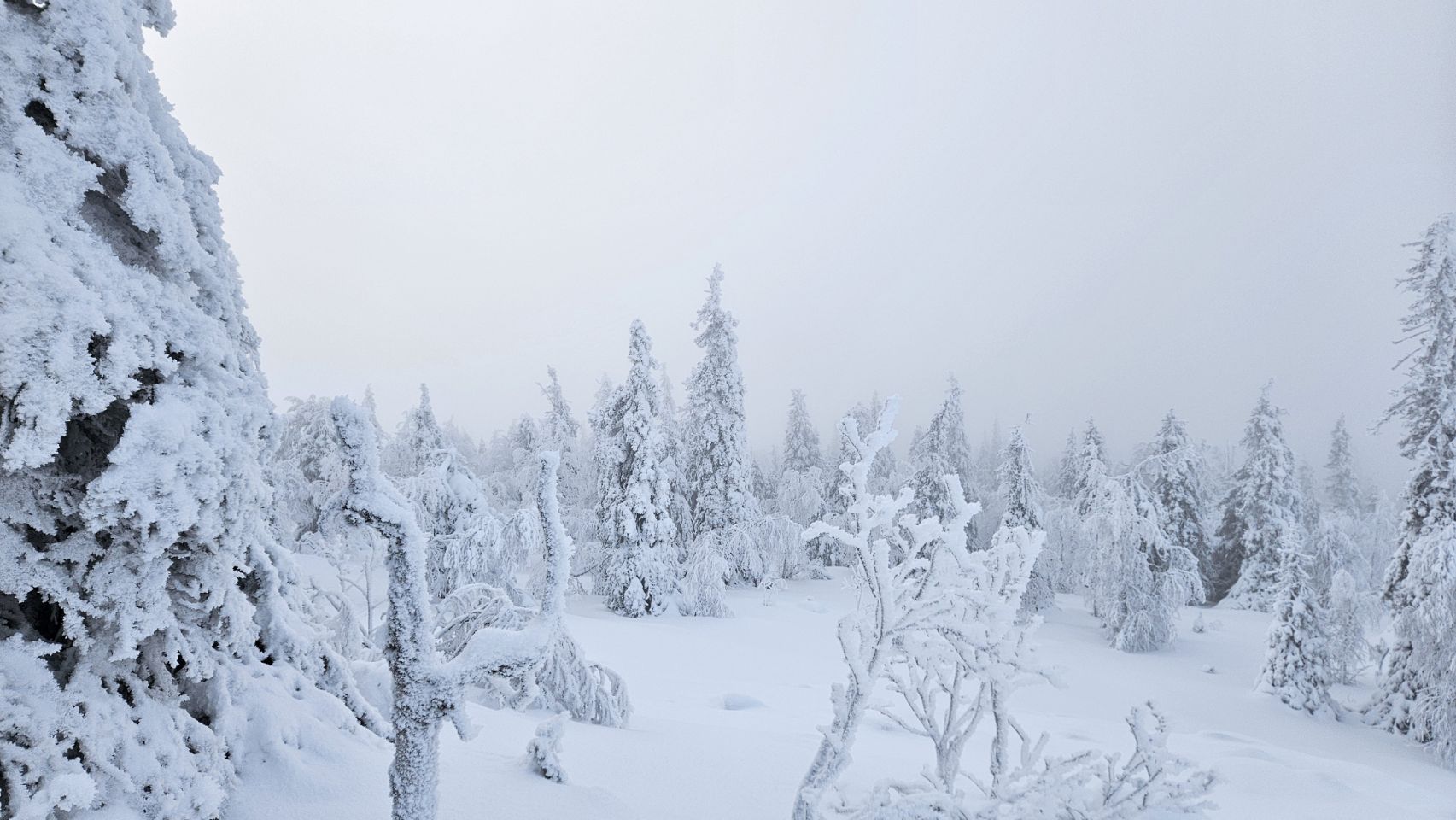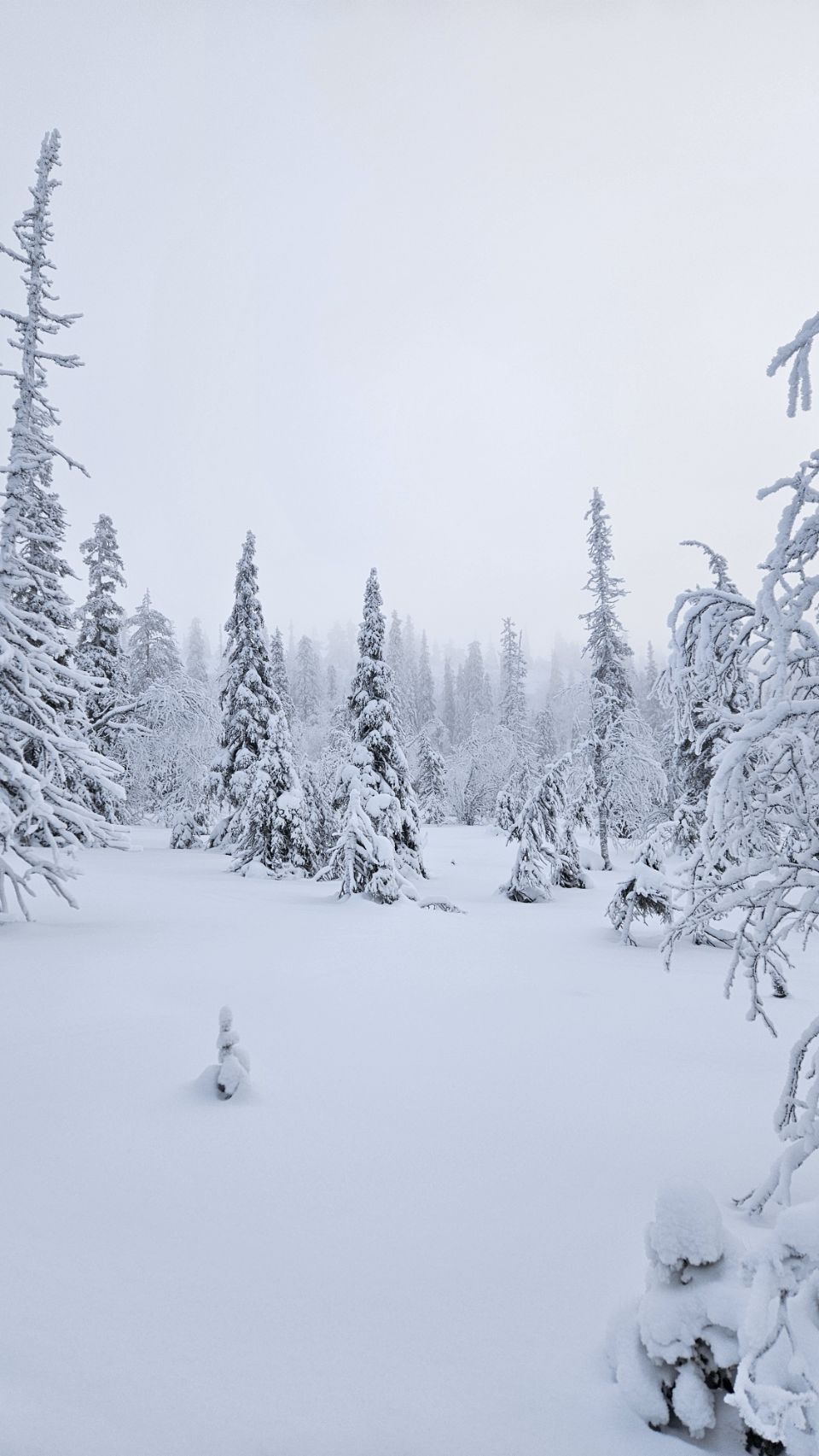 Chaque pas nous plonge un peu plus dans cette atmosphère irréelle. Tout est blanc. Le sol, les arbres, l’air semble presque immobile. C’est une sensation difficile à décrire, mais profondément marquante : un mélange de plénitude, de calme absolu, et de respect face à une nature aussi dure que magnifique.