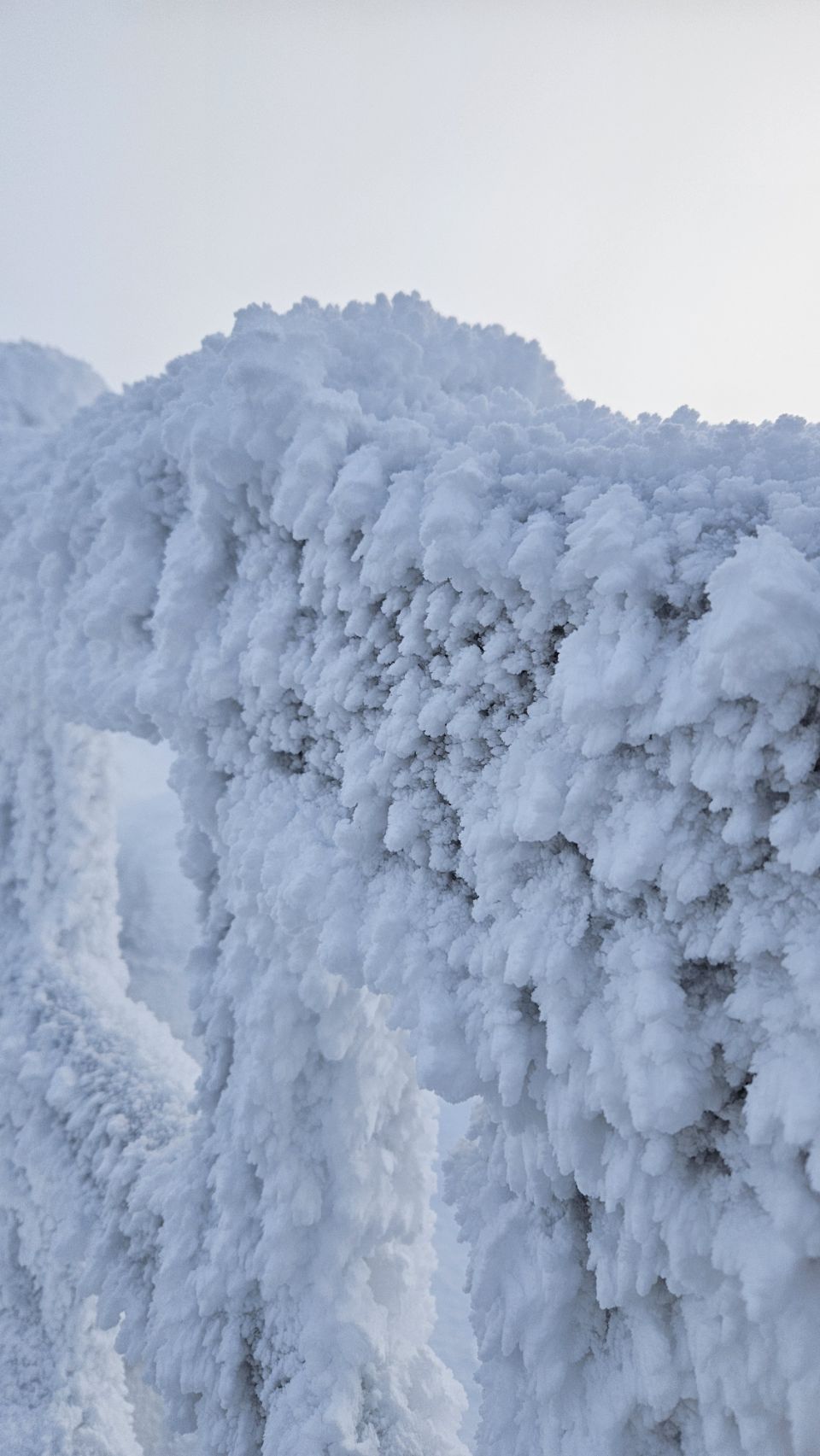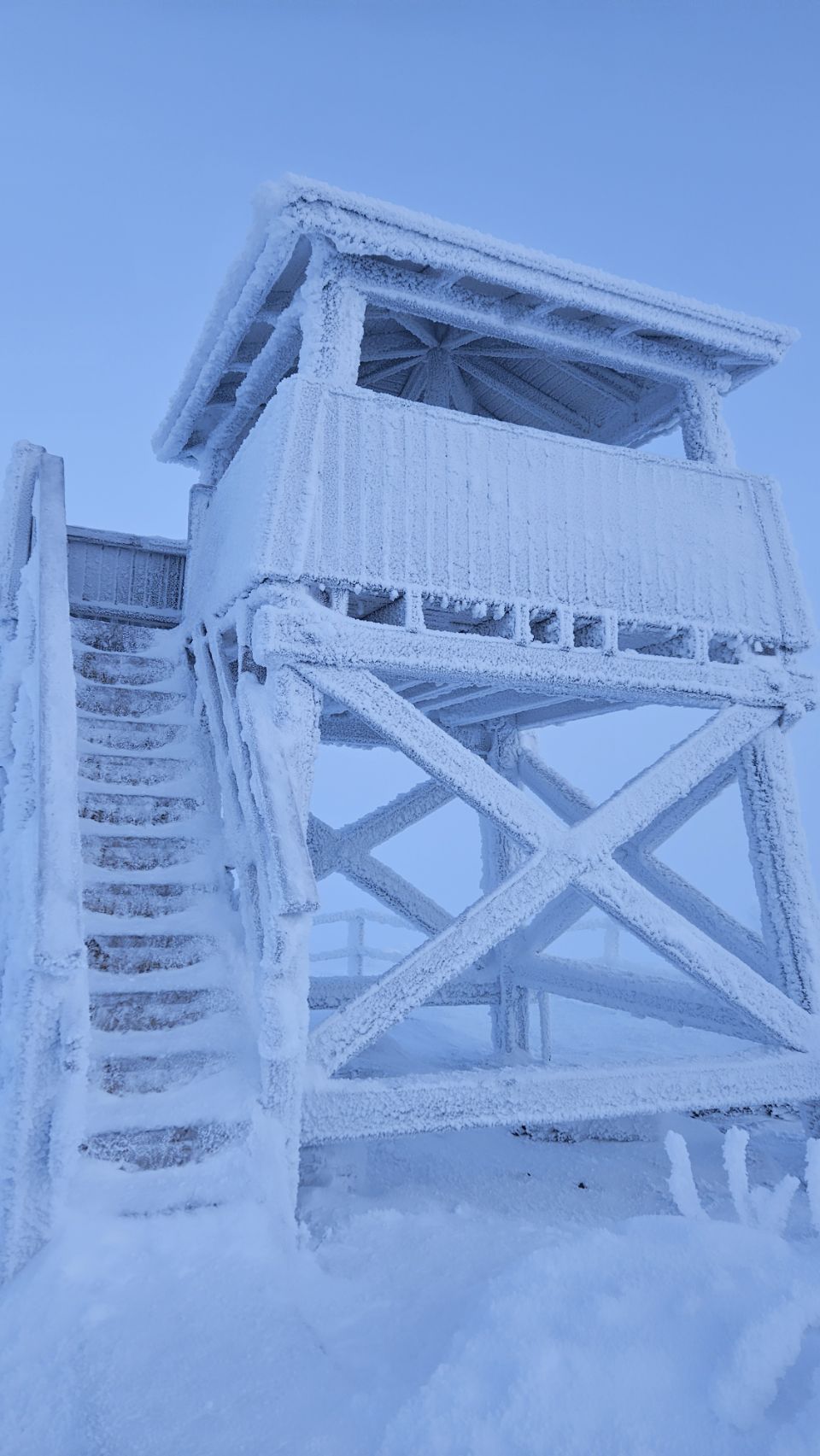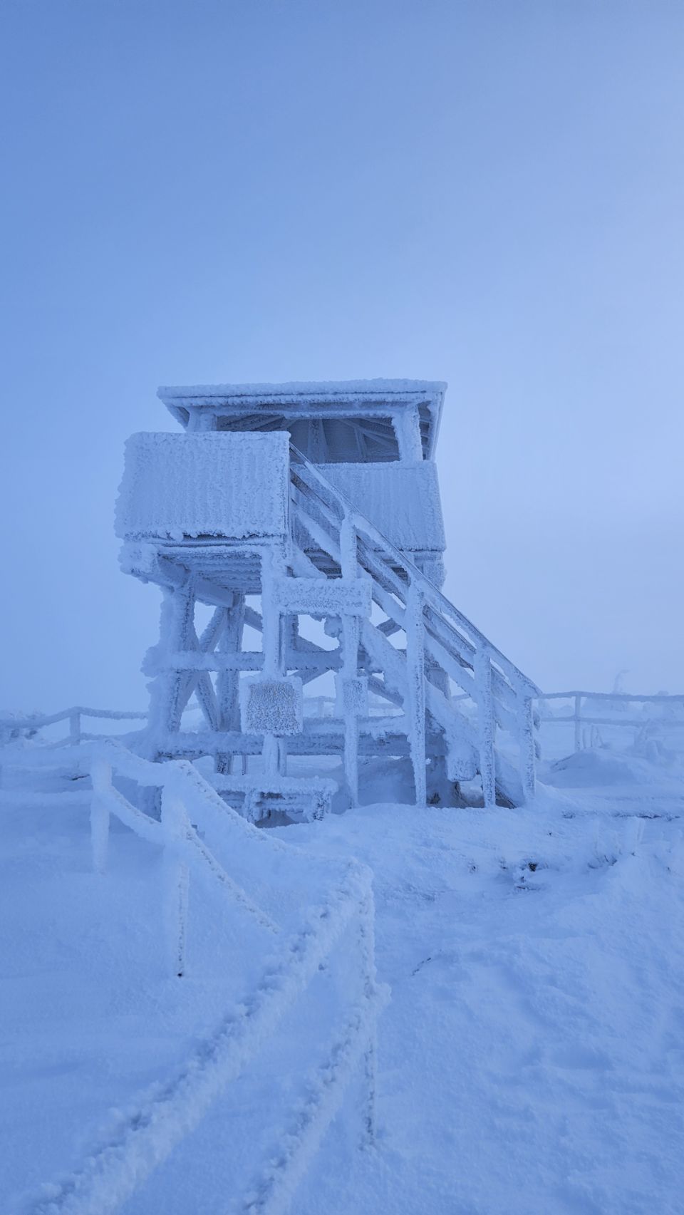 La montée commence doucement, en direction d’une tour d’observation. Plus on avance, plus le paysage se transforme. Les sapins deviennent de plus en plus blancs, chargés de neige et de givre. Le silence est total. Un silence profond, presque assourdissant, qui apaise instantanément. On a vraiment cette impression d’être seuls au monde, comme si tout s’était figé autour de nous.