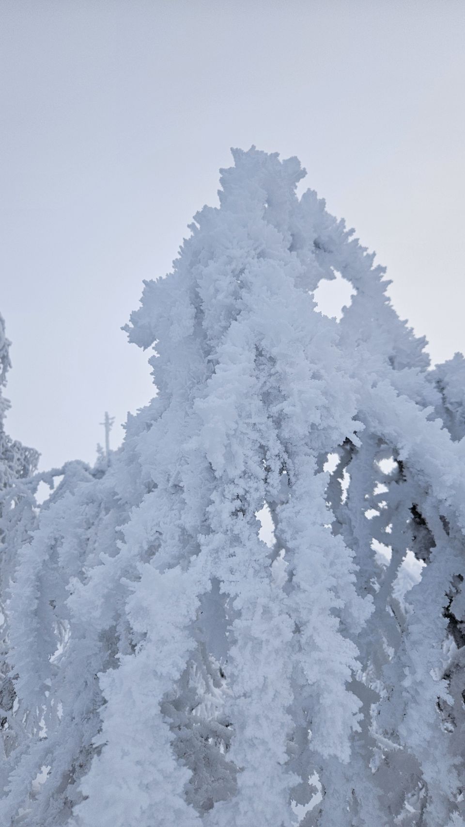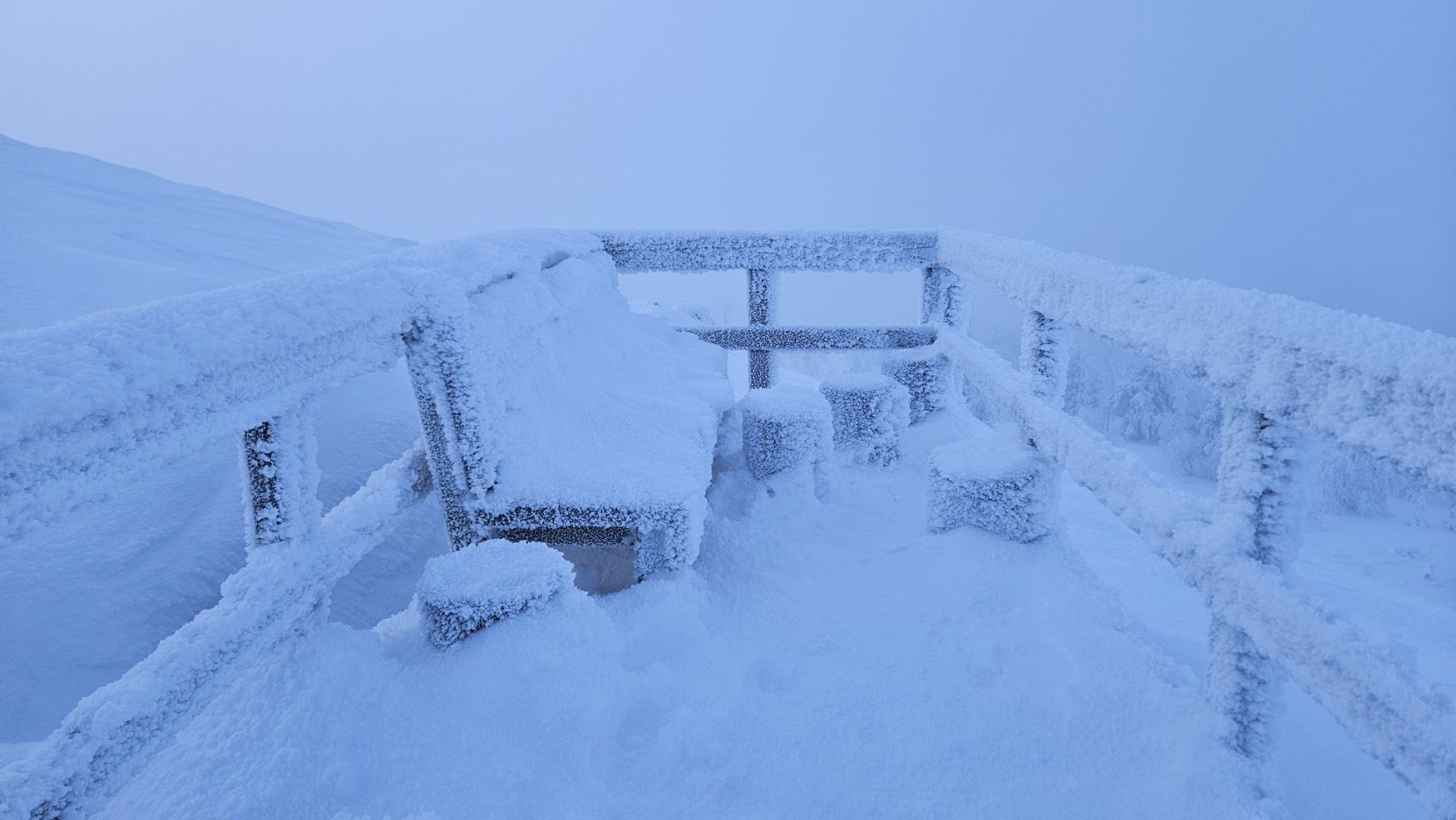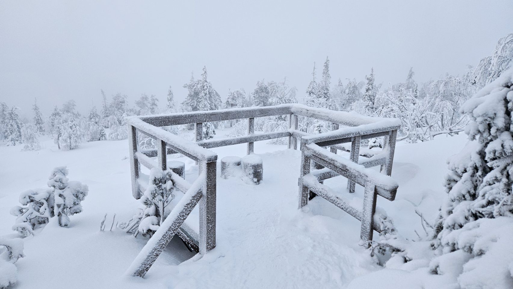 La montée commence doucement, en direction d’une tour d’observation. Plus on avance, plus le paysage se transforme. Les sapins deviennent de plus en plus blancs, chargés de neige et de givre. Le silence est total. Un silence profond, presque assourdissant, qui apaise instantanément. On a vraiment cette impression d’être seuls au monde, comme si tout s’était figé autour de nous.