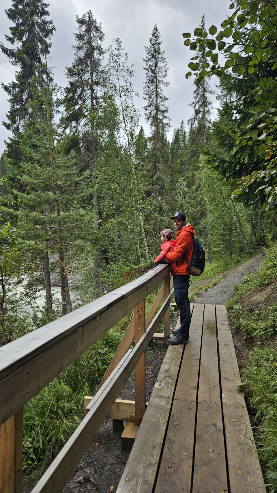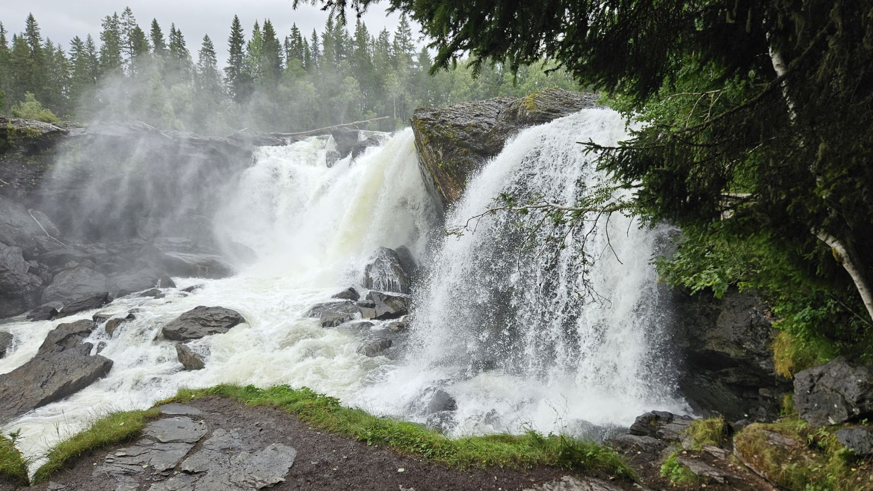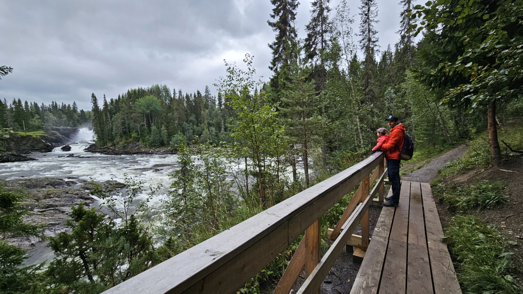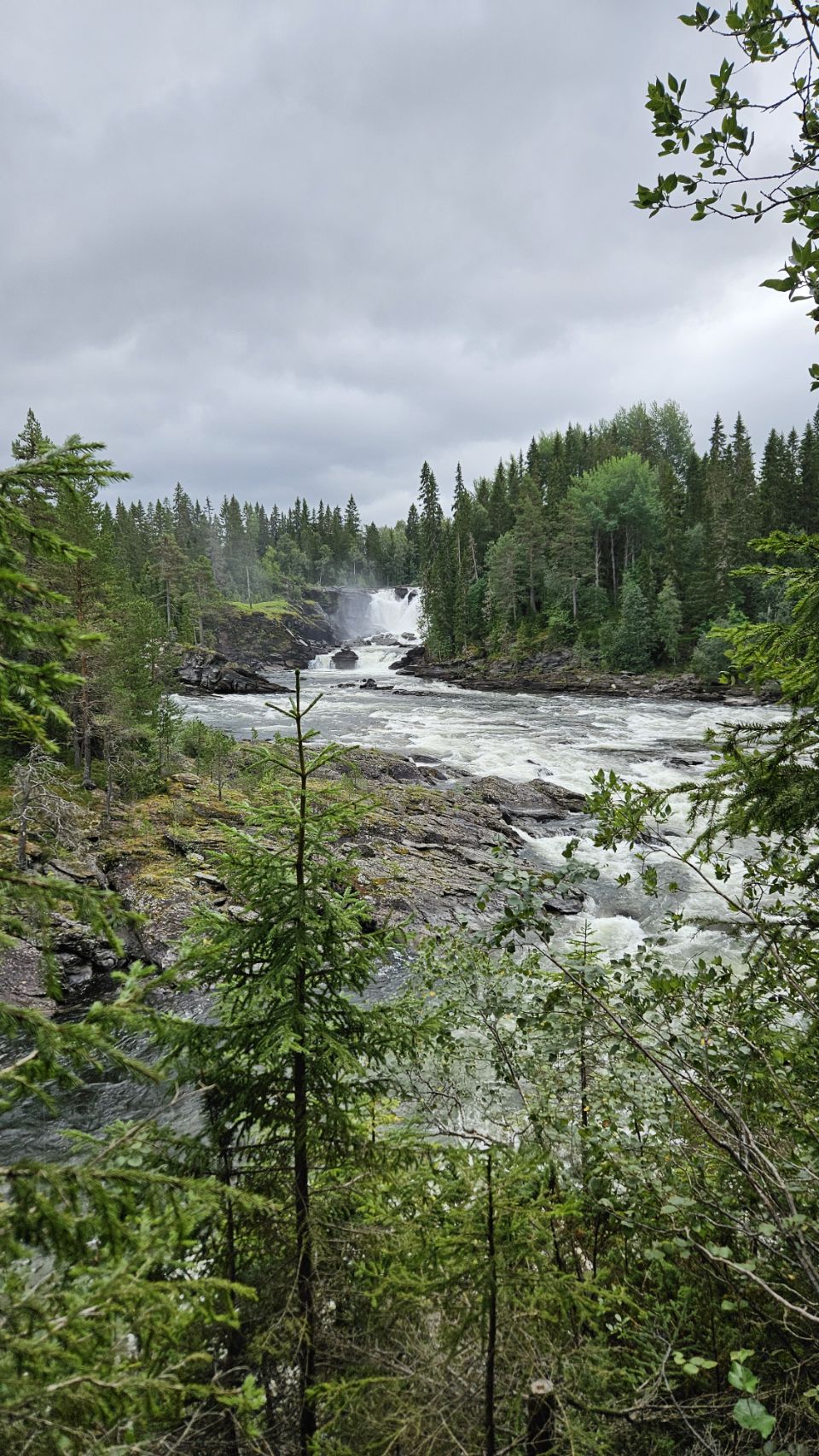 Nouvelle cascade sur notre route : Ristafallet. Située dans un cadre verdoyant et facilement accessible, elle est moins connue que Tännforsen mais tout aussi impressionnante avec ses puissants remous. Un petit sentier permet de longer la rivière et d’approcher la chute sous différents angles, offrant une belle balade rapide.