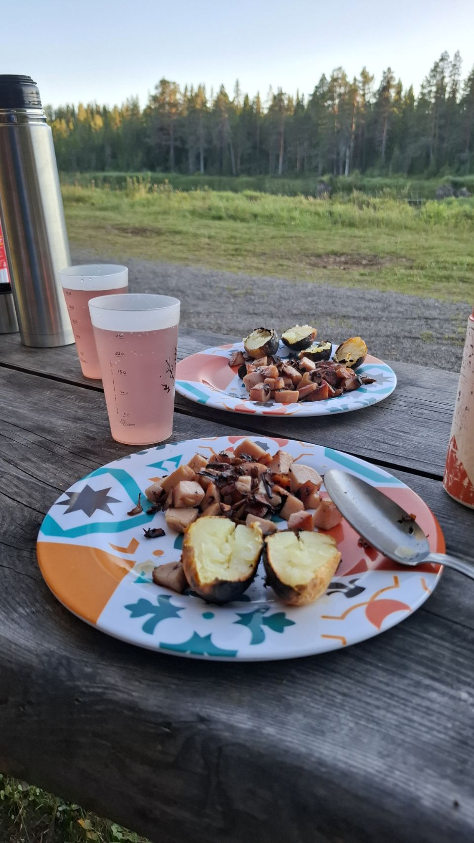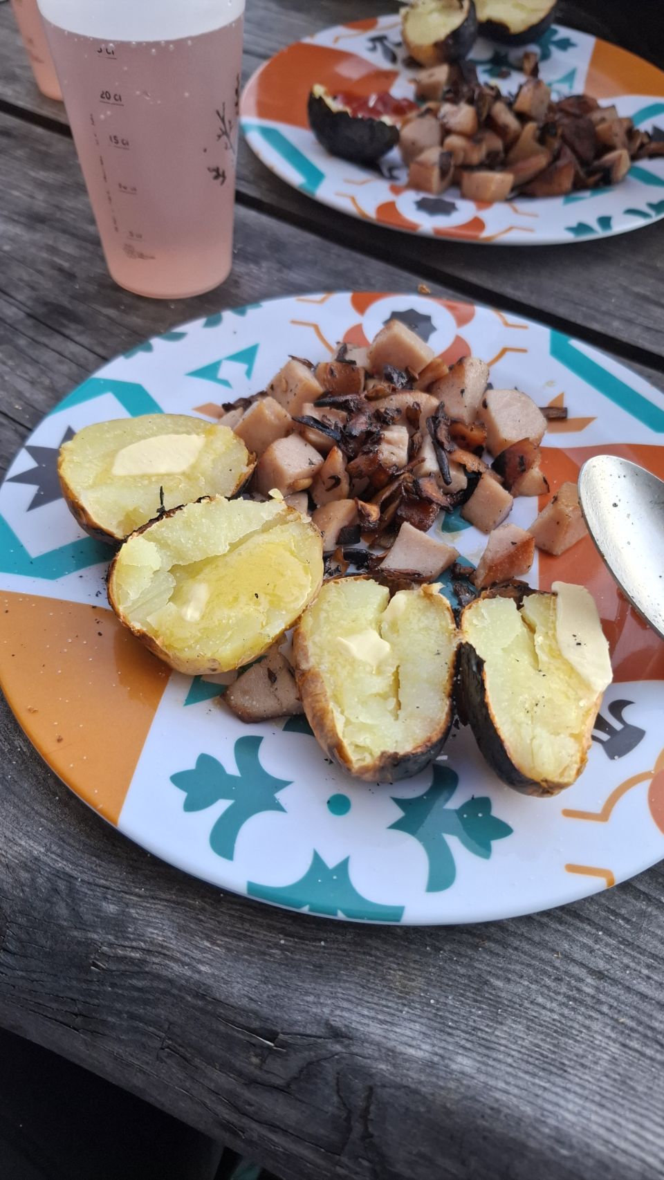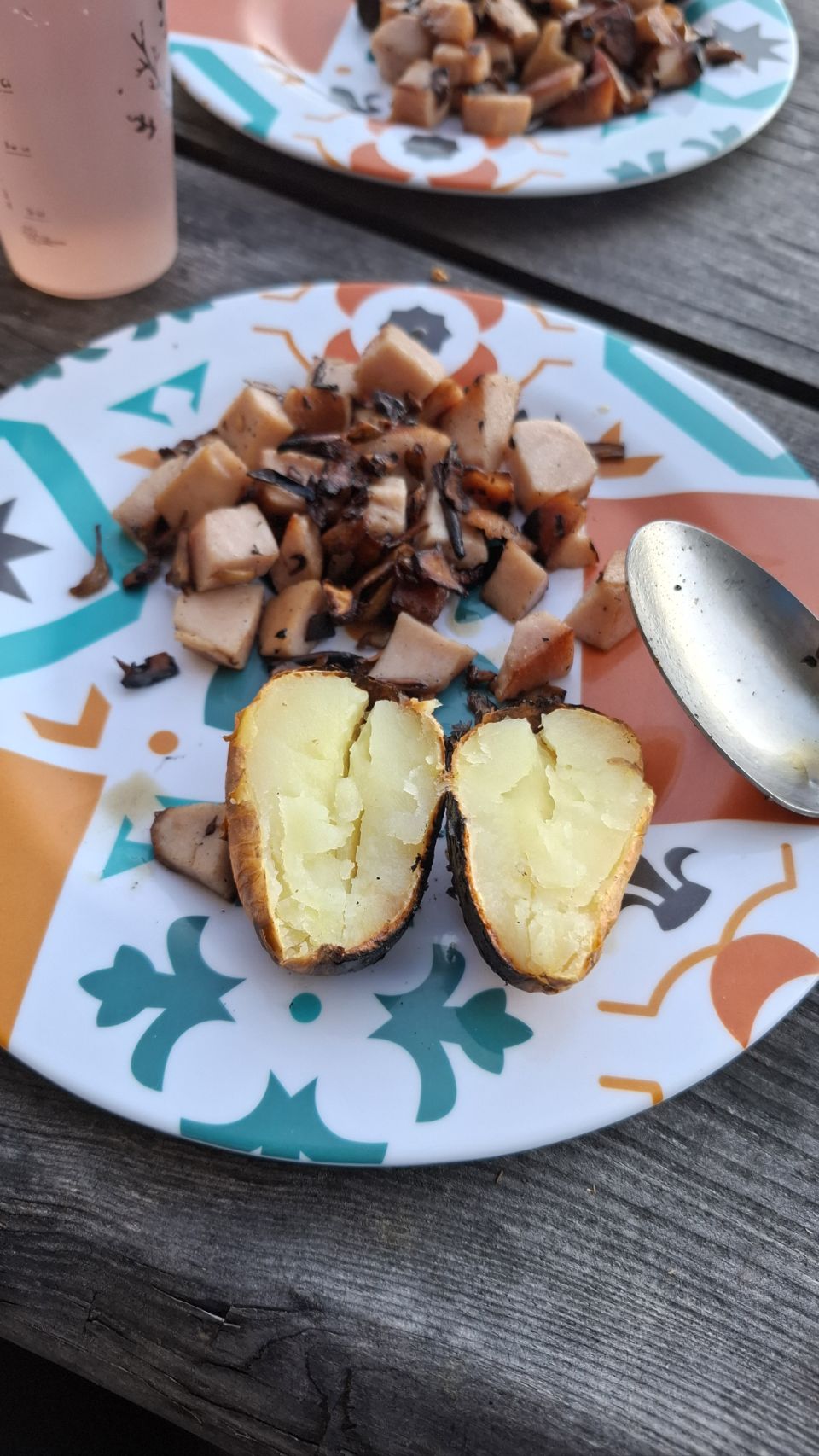 De retour au campement, l’envie de prolonger cette belle ambiance nous motive à lancer le barbecue. Au menu du soir : pommes de terre dorées, saucisses grillées et nos champignons fraîchement cueillis. Un vrai festin simple et convivial, savouré face à la rivière. Le genre de moment qui résume parfaitement l’esprit de notre voyage : nature, autonomie, petits plaisirs et beaucoup de sérénité.