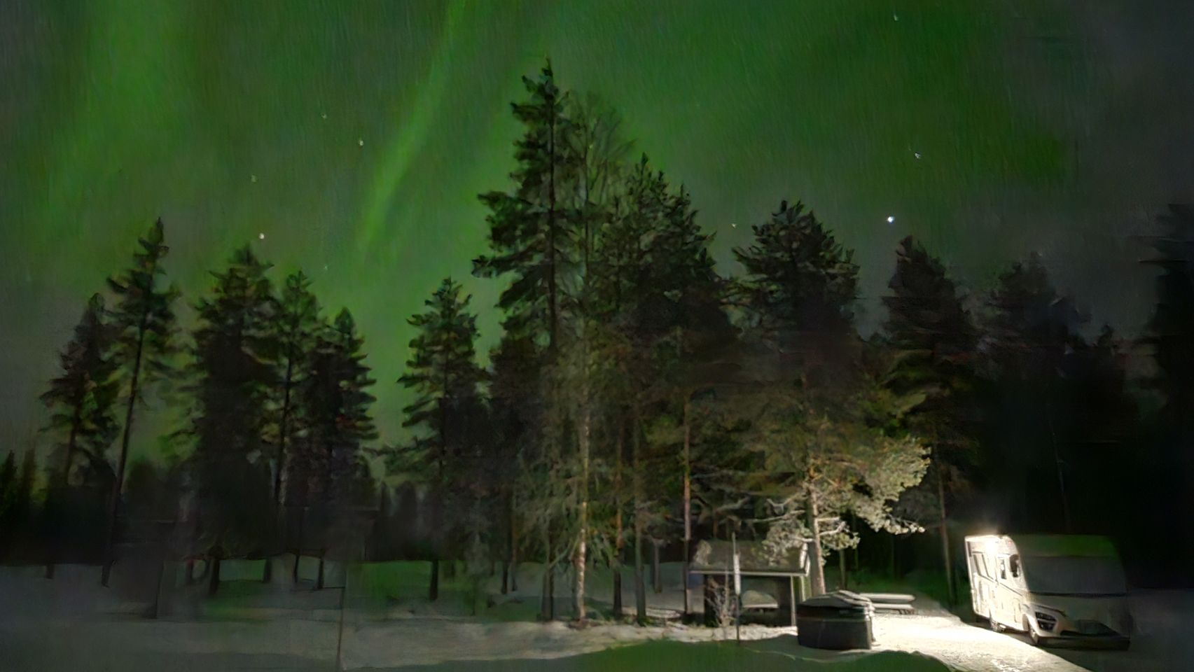 Et d’un coup, le ciel commence doucement à danser. On est tranquilles sur le parking, mis à part un autre petit van qui nous a rejoint dans la soirée. Mais, sans prévenir, vers 22h, deux fourgons remplis de touristes chinois débarquent pour photographier les aurores boréales. Autant dire que le calme vole en éclats : portières, discussions, appareils photo dans tous les sens.