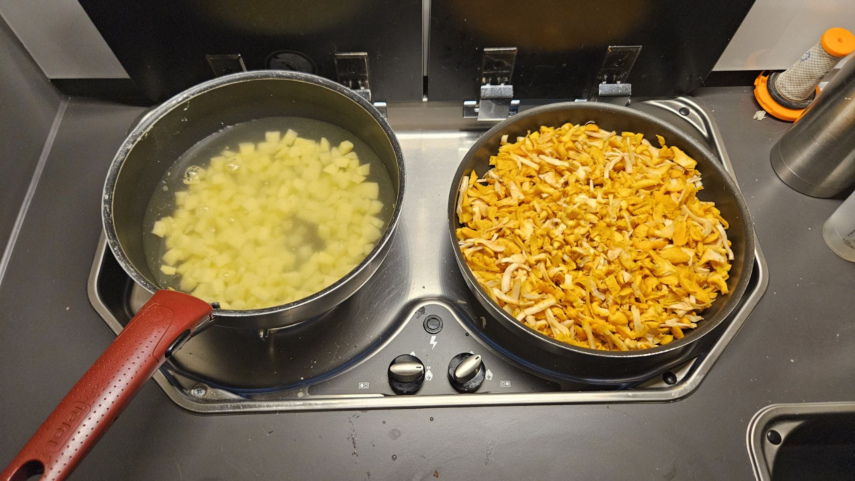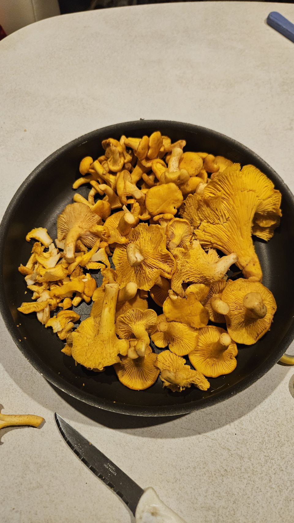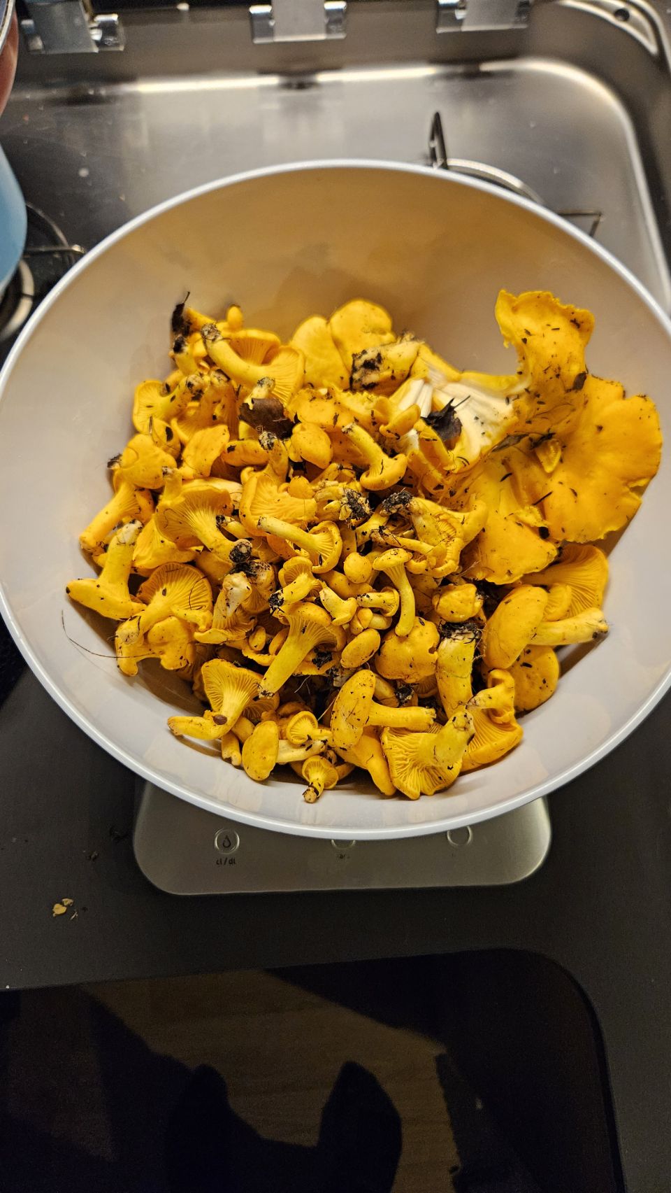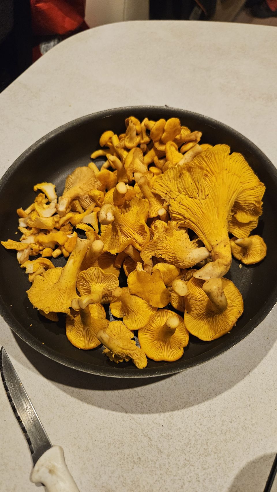Sur le chemin du retour, jackpot : deux girolles, dont une énorme, jamais vue auparavant ! De fil en aiguille, nous nous lançons dans une véritable cueillette et finissons avec 700g. De quoi préparer une délicieuse soupe aux girolles le soir-même. Verdict : un vrai régal. Le ciel du soir se pare de jolies couleurs, parfait pour rentrer au camping-car et boucler la journée.