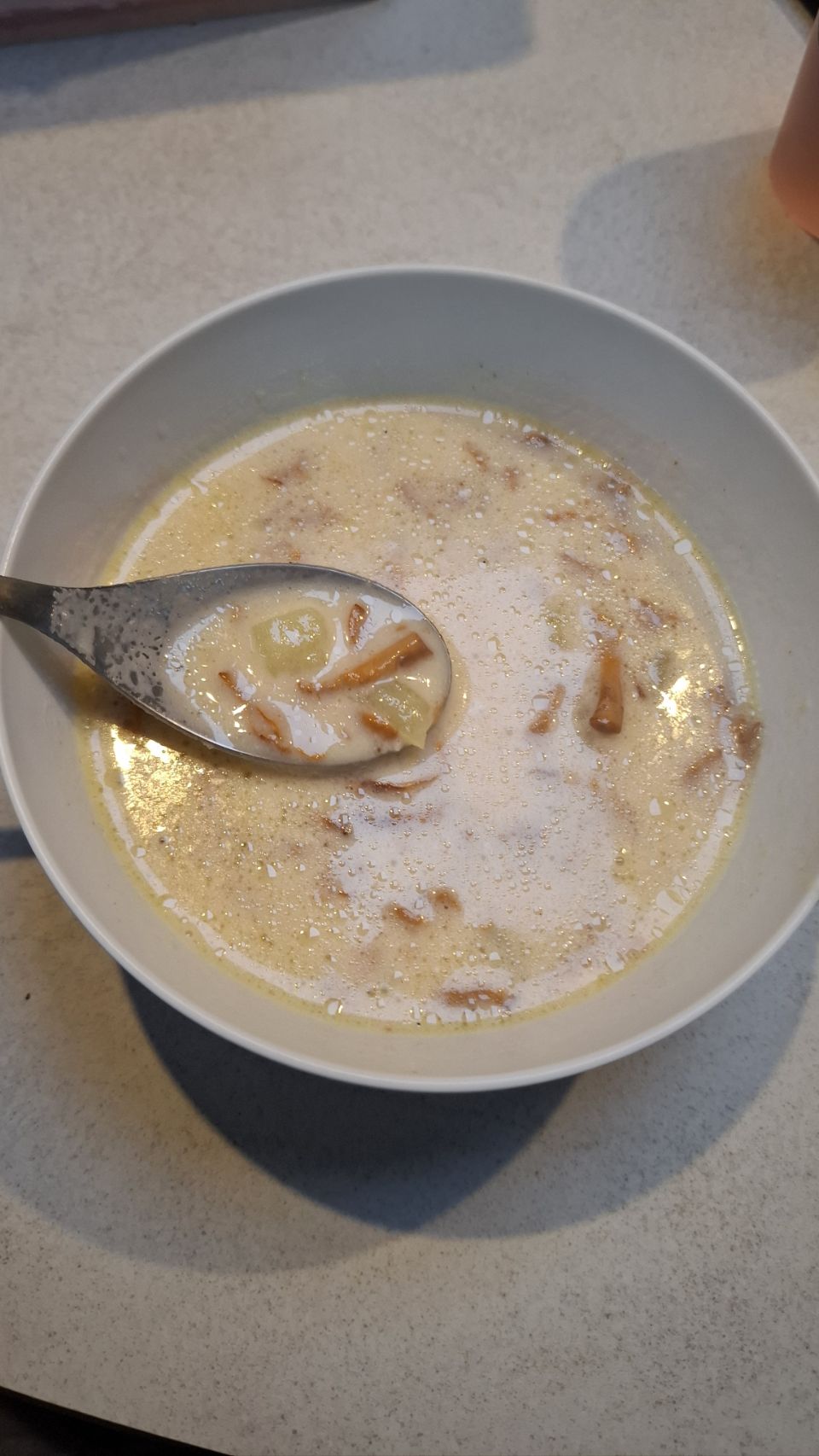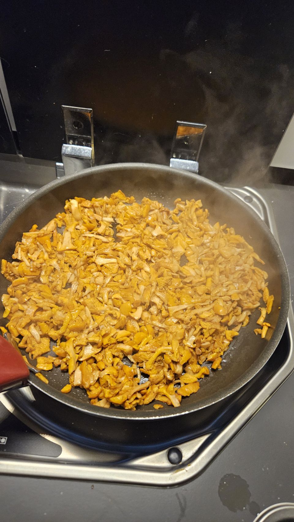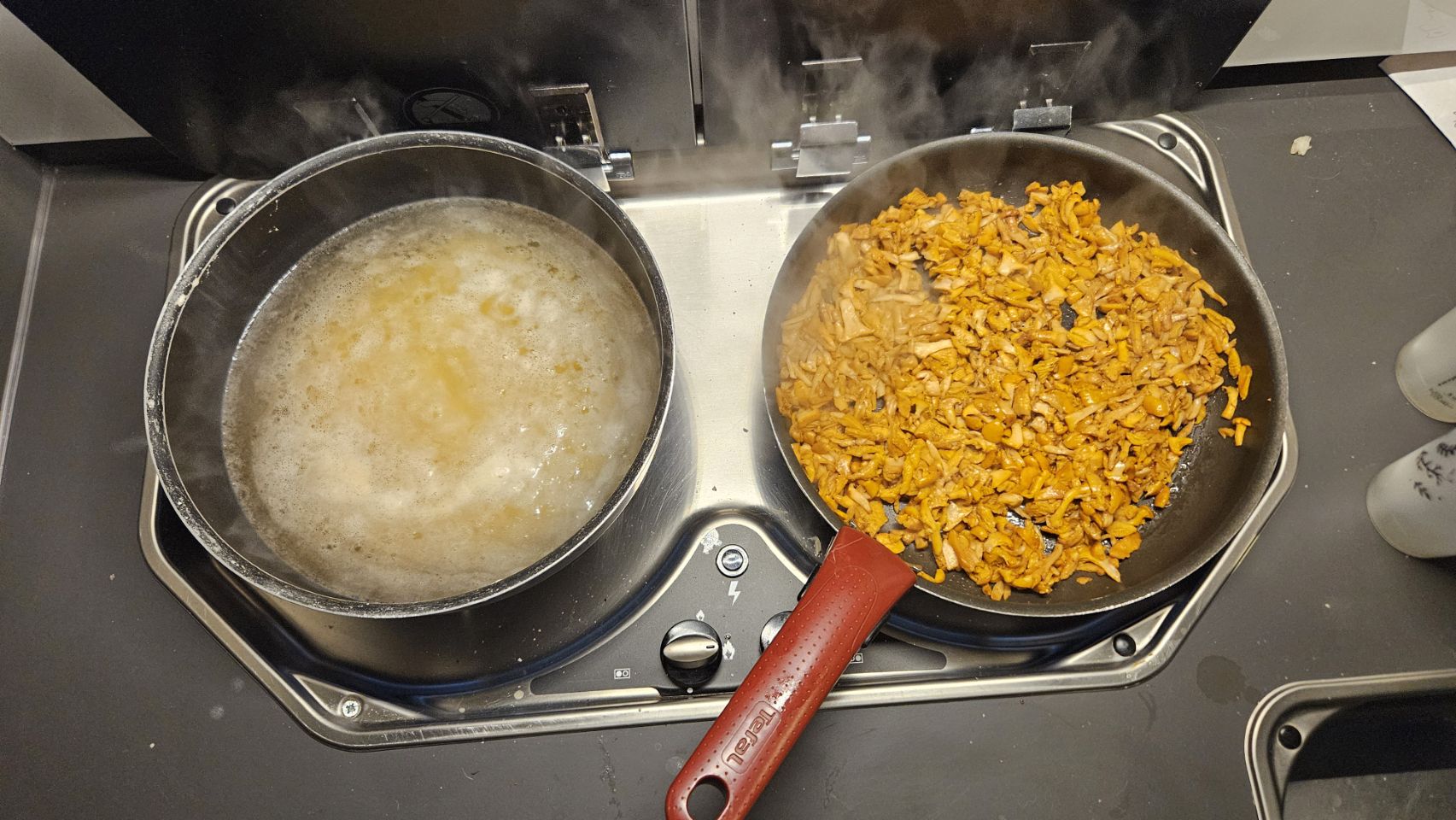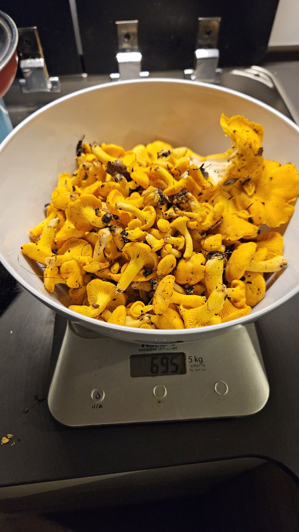 Sur le chemin du retour, jackpot : deux girolles, dont une énorme, jamais vue auparavant ! De fil en aiguille, nous nous lançons dans une véritable cueillette et finissons avec 700g. De quoi préparer une délicieuse soupe aux girolles le soir-même. Verdict : un vrai régal. Le ciel du soir se pare de jolies couleurs, parfait pour rentrer au camping-car et boucler la journée.