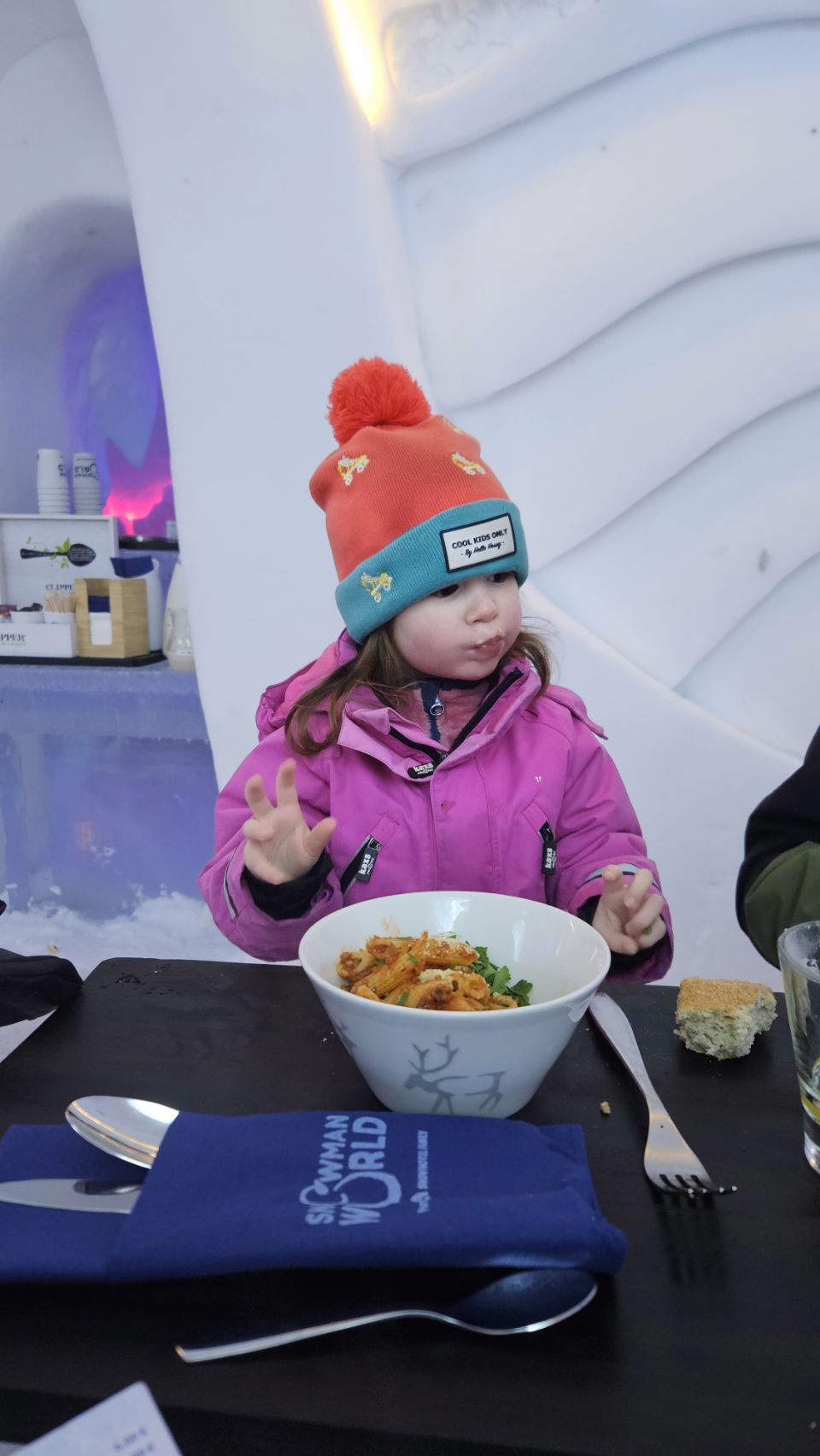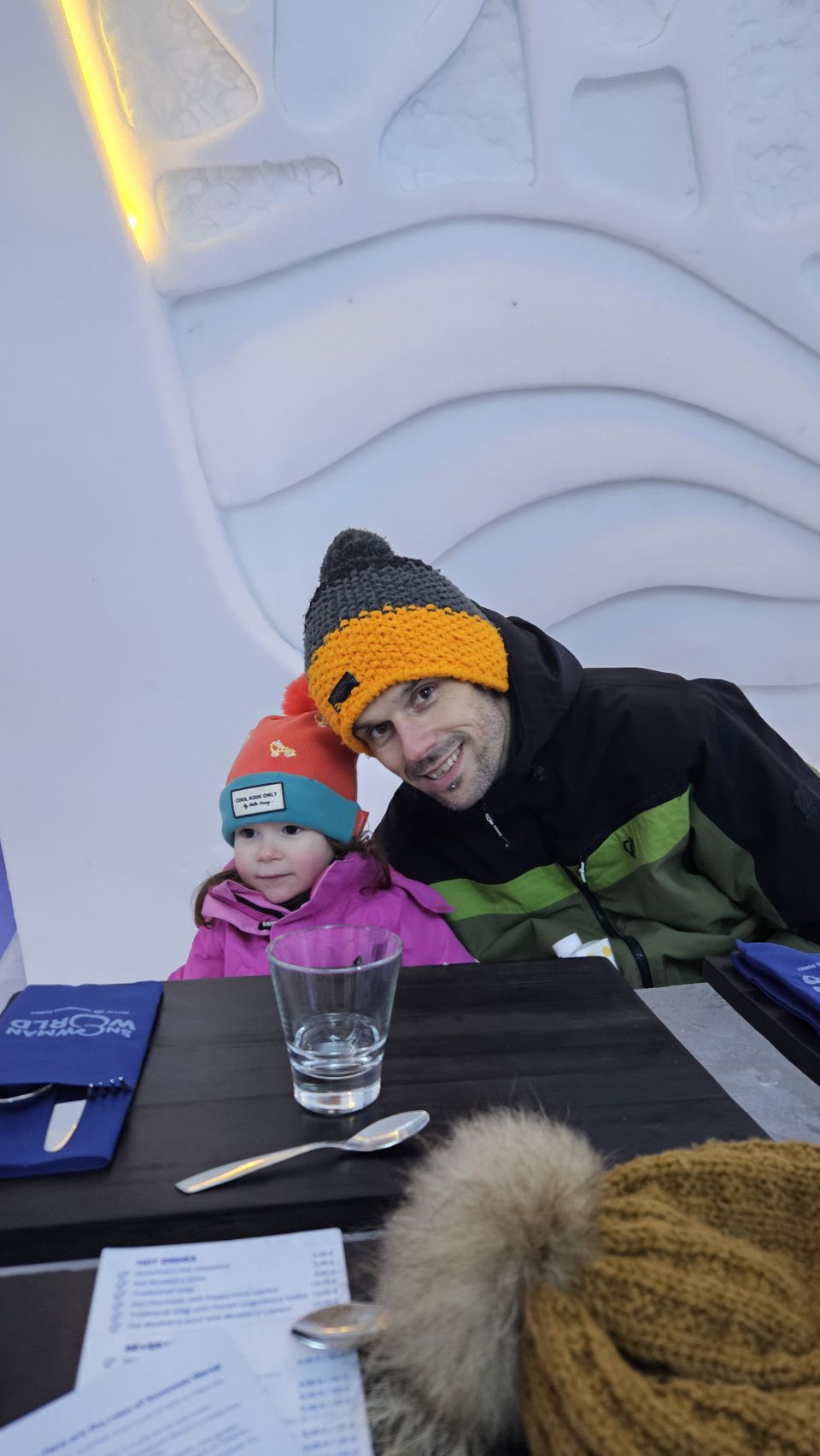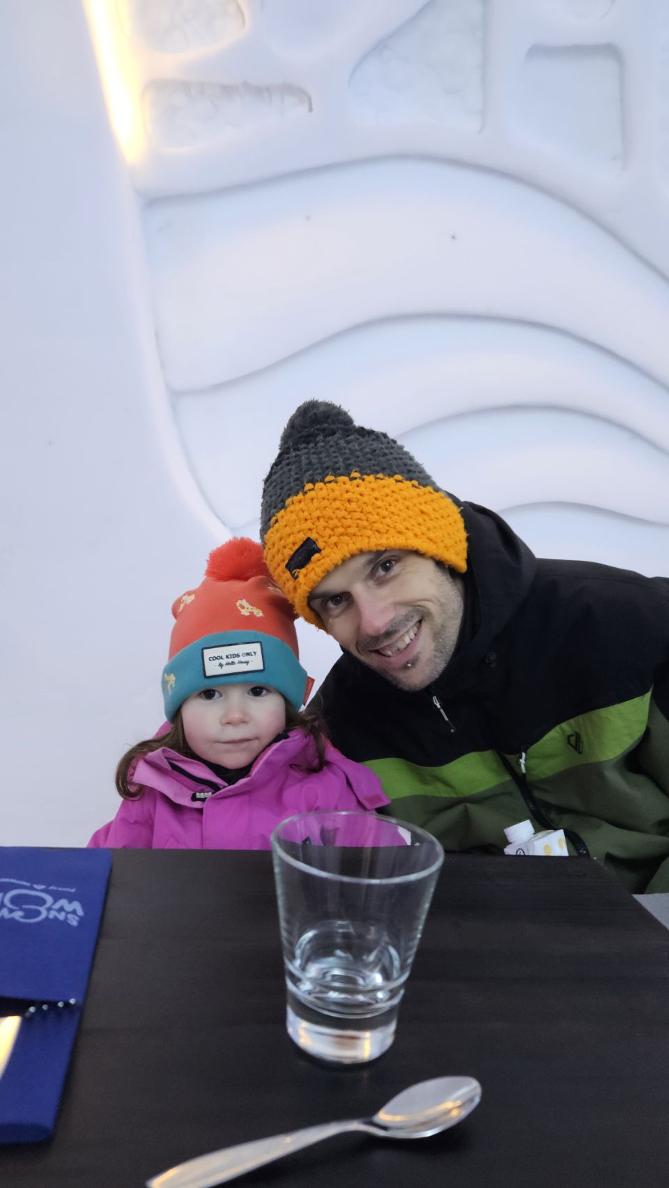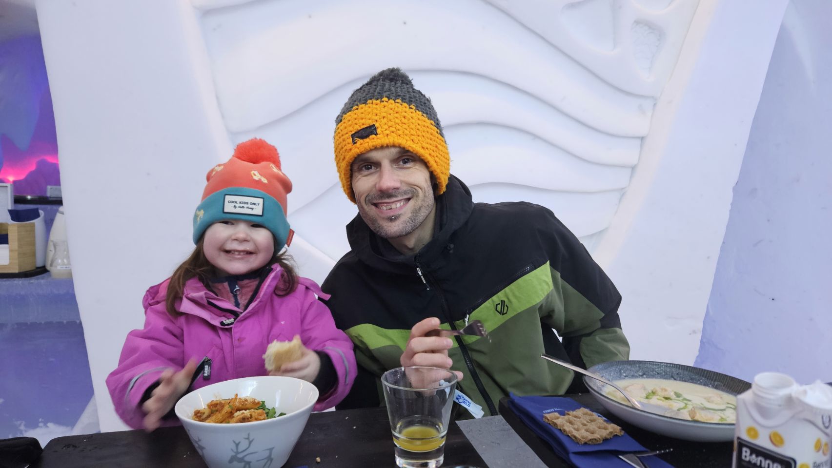 Le midi, on avait réservé au Ice Restaurant, le restaurant de glace du Snowman World. Au menu : soupe au saumon pour nous, spécialité finlandaise, petites pâtes bolognaises pour Lou, et en dessert un petit muffin à la myrtille. Le repas en lui-même n’était pas exceptionnel, mais le cadre et l’expérience compensent largement.