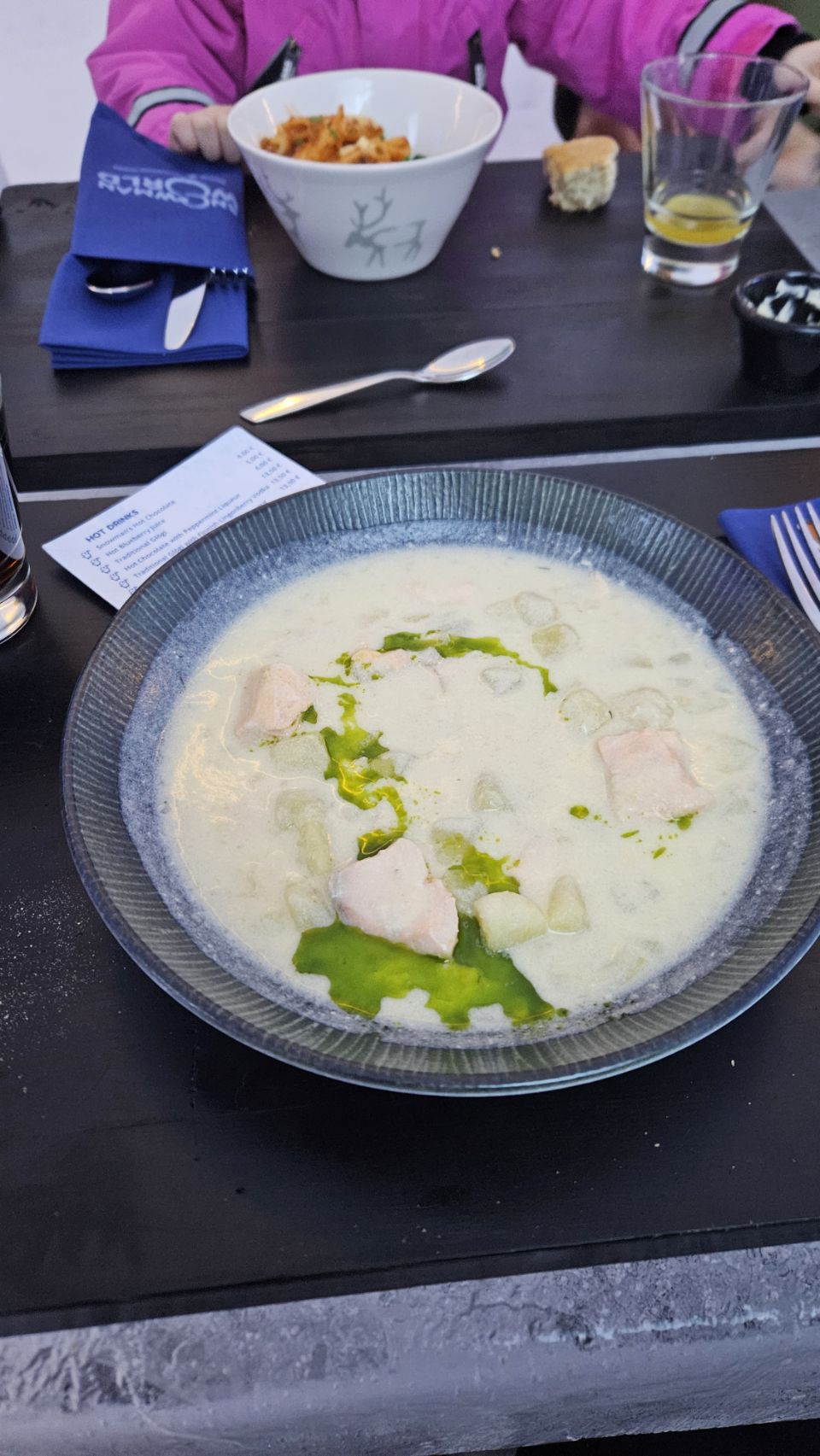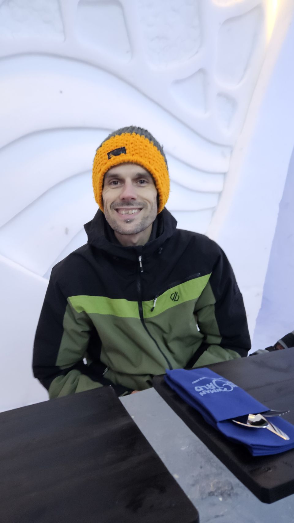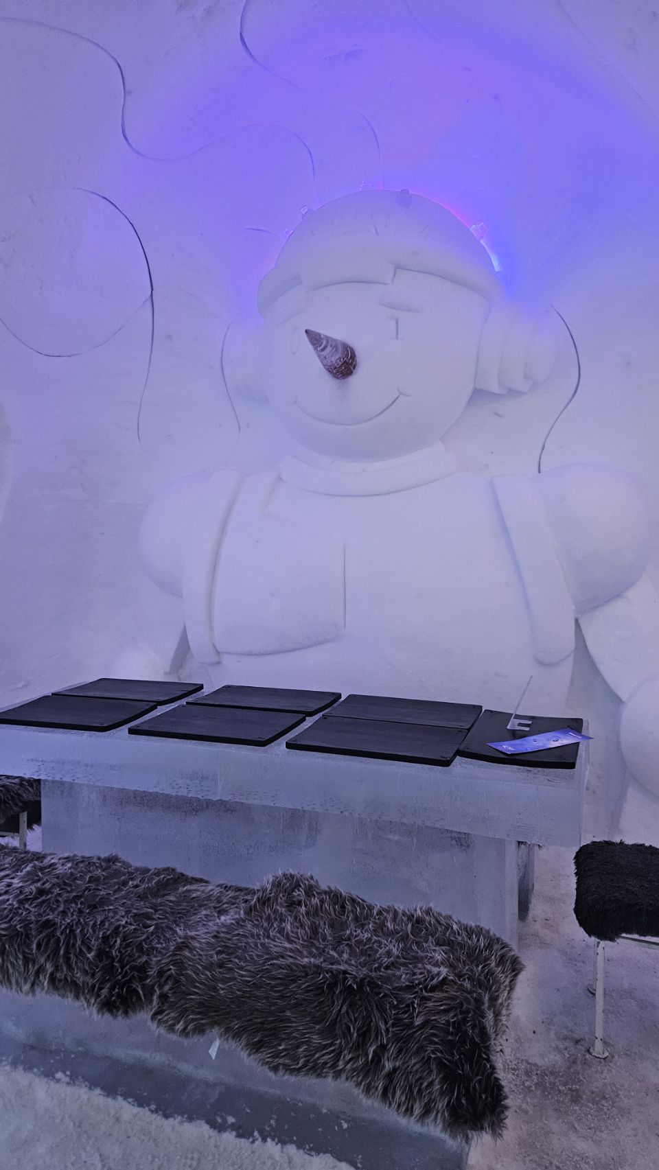 Le midi, on avait réservé au Ice Restaurant, le restaurant de glace du Snowman World. Au menu : soupe au saumon pour nous, spécialité finlandaise, petites pâtes bolognaises pour Lou, et en dessert un petit muffin à la myrtille. Le repas en lui-même n’était pas exceptionnel, mais le cadre et l’expérience compensent largement.
