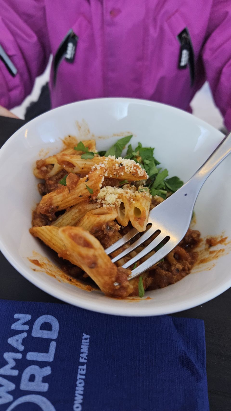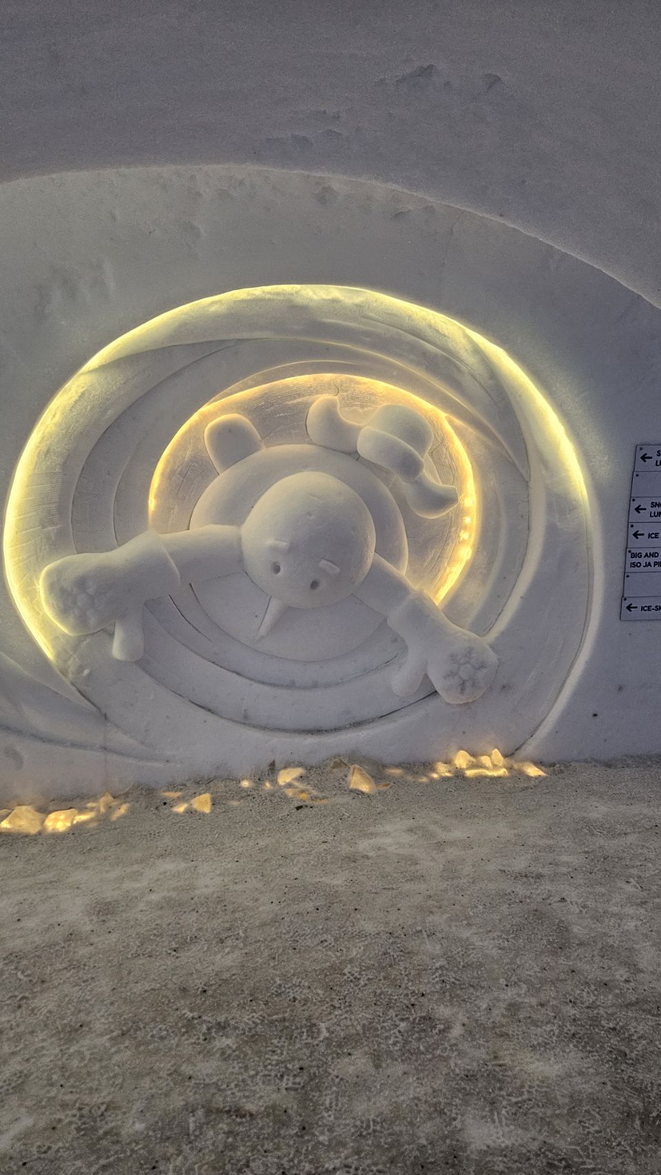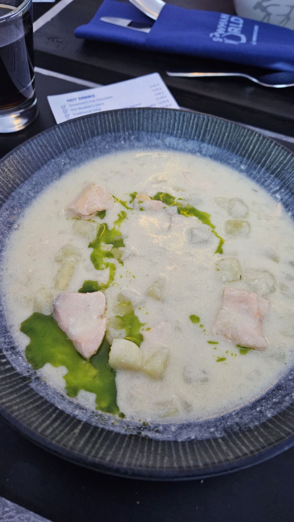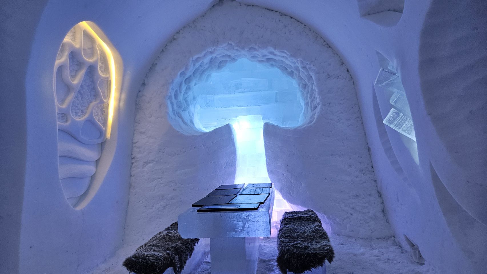 Le midi, on avait réservé au Ice Restaurant, le restaurant de glace du Snowman World. Au menu : soupe au saumon pour nous, spécialité finlandaise, petites pâtes bolognaises pour Lou, et en dessert un petit muffin à la myrtille. Le repas en lui-même n’était pas exceptionnel, mais le cadre et l’expérience compensent largement.
