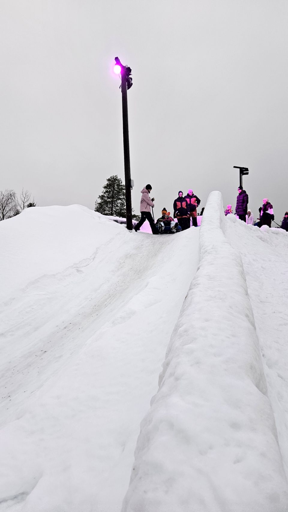 On est ensuite rentrés se poser un peu pour la sieste au camping-car, histoire de récupérer, parce que le froid et l’excitation, ça fatigue vite. Et en fin de journée, on est revenus… et là, changement total d’ambiance. La nuit tombée, avec les lumières, c’était encore plus magique. On a réenchaîné un nombre de descentes assez impressionnant.